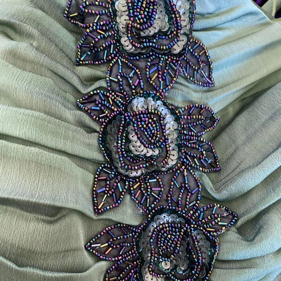 Green strapless evening midi dress with runched detailing, a bead & sequin detail front, an adjustable ribbon lace up back, boning to the waist & bust & a zip up the back UK 10