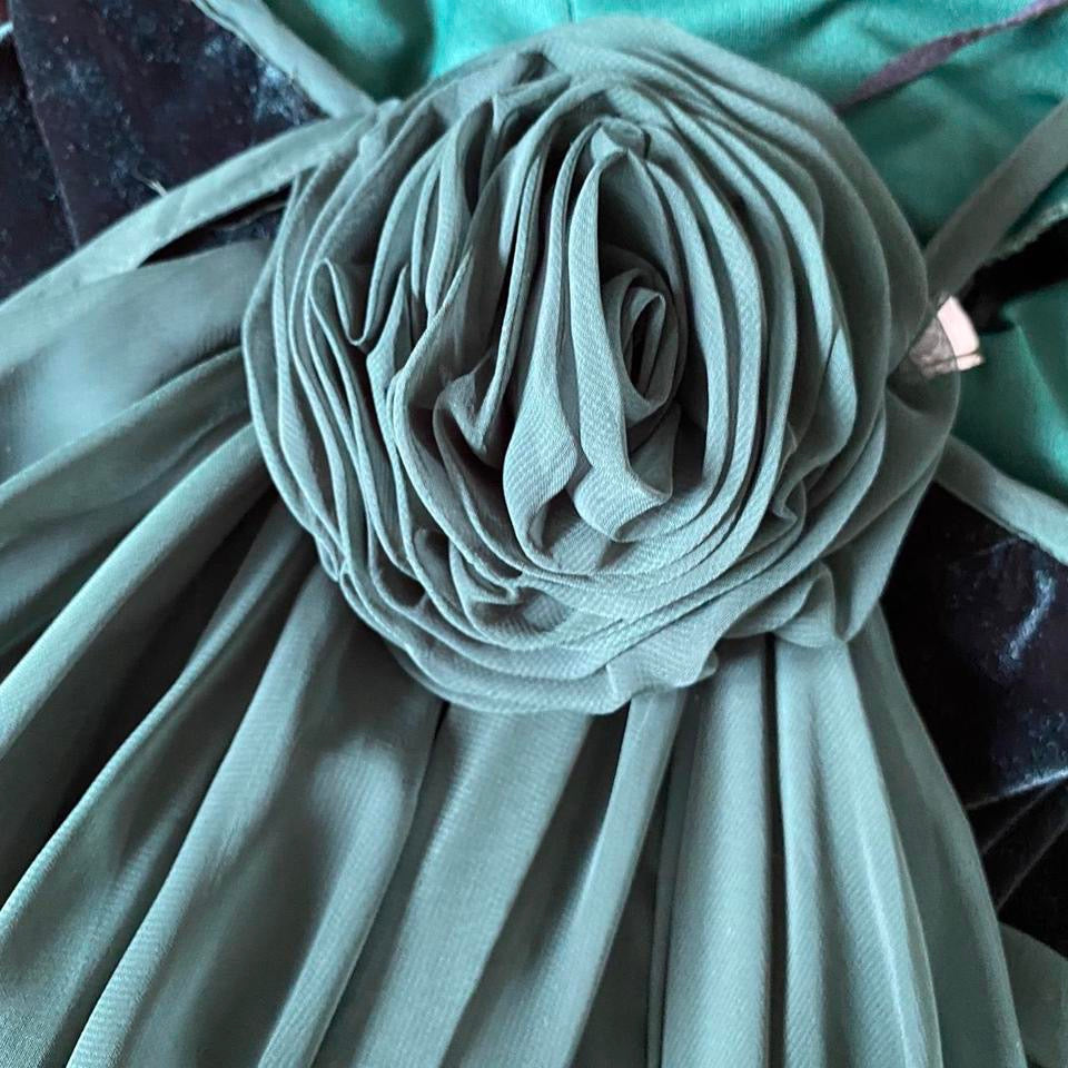 Dark green velvet stretch evening dress with a chiffon trail down with back & a zip/popper fastening at the back UK 8