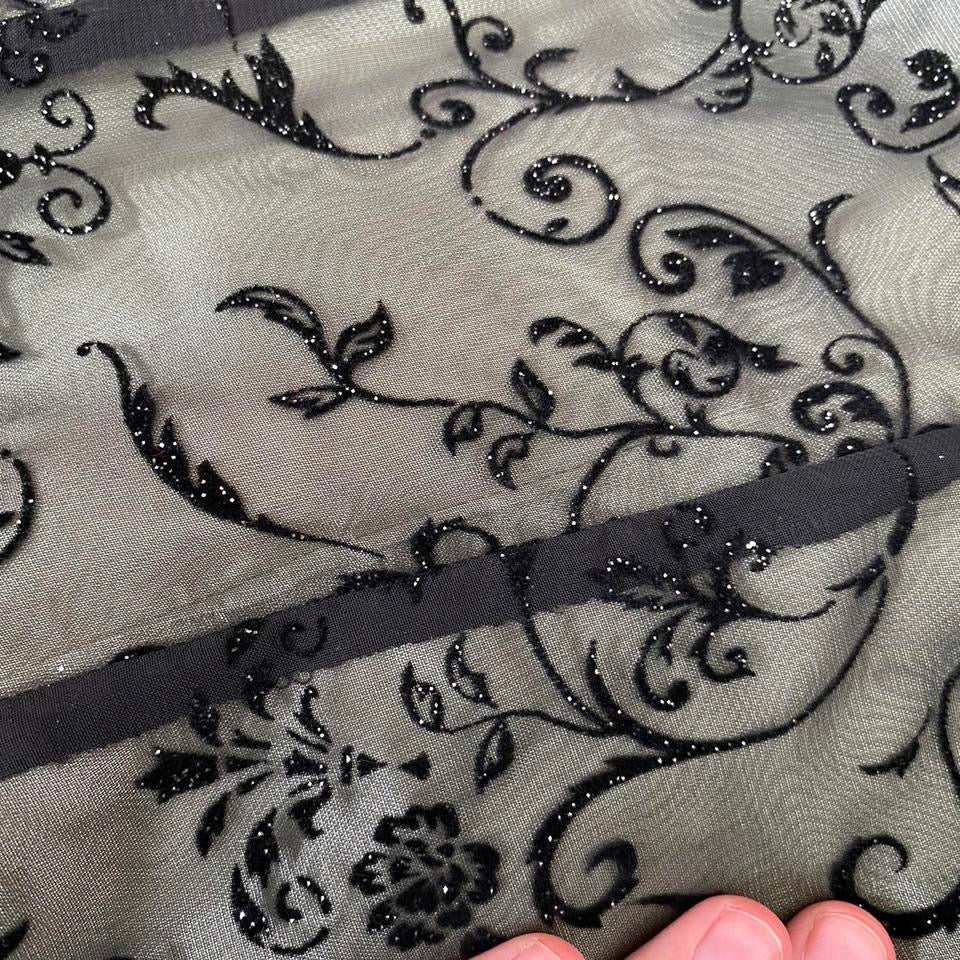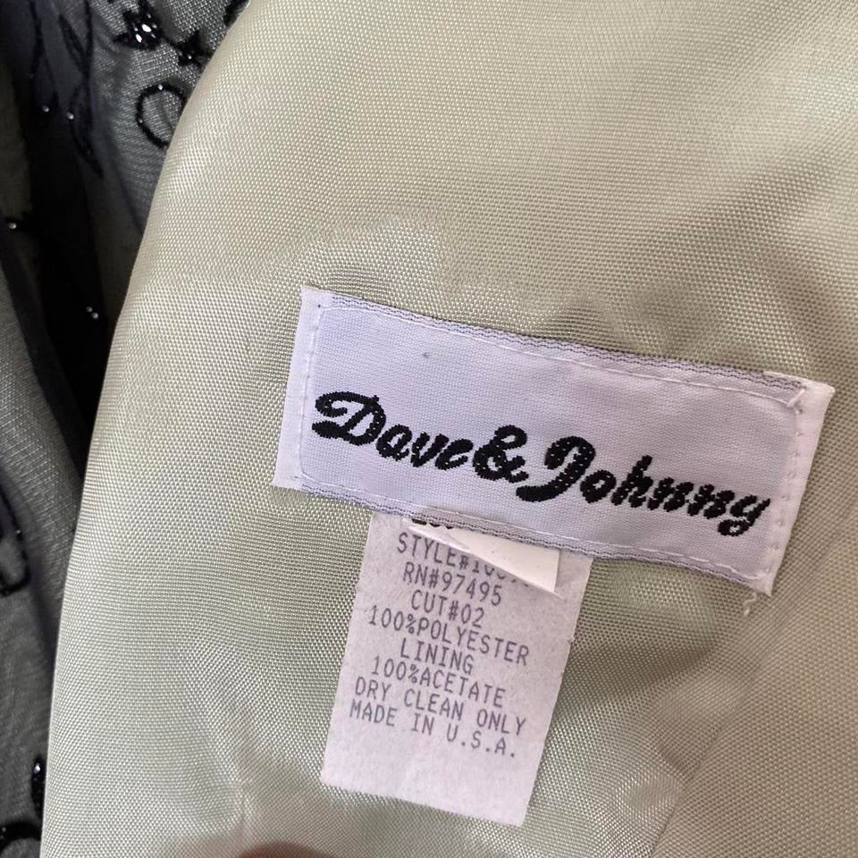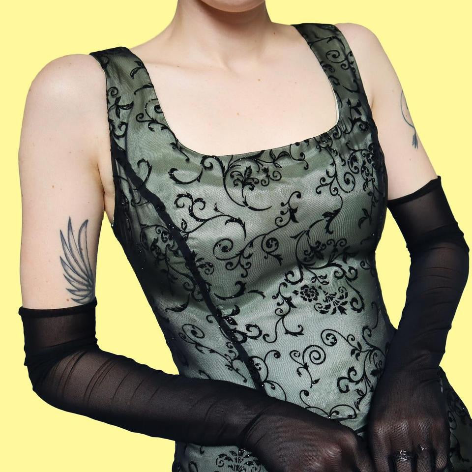 🌹Beautiful light green a line evening dress with a sheer black glittery floral overlay & a zip up the back UK 14🌹