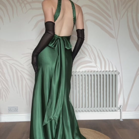 🌹Green silky satin evening dress with trail at the back, open back with hook & eye fastenings at the back of the neck, a padded bust, bead/sequin detailing & a zip up the back UK 8🌹
