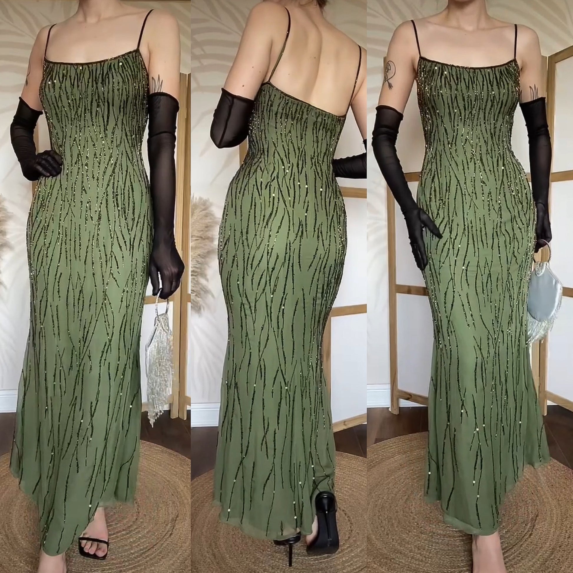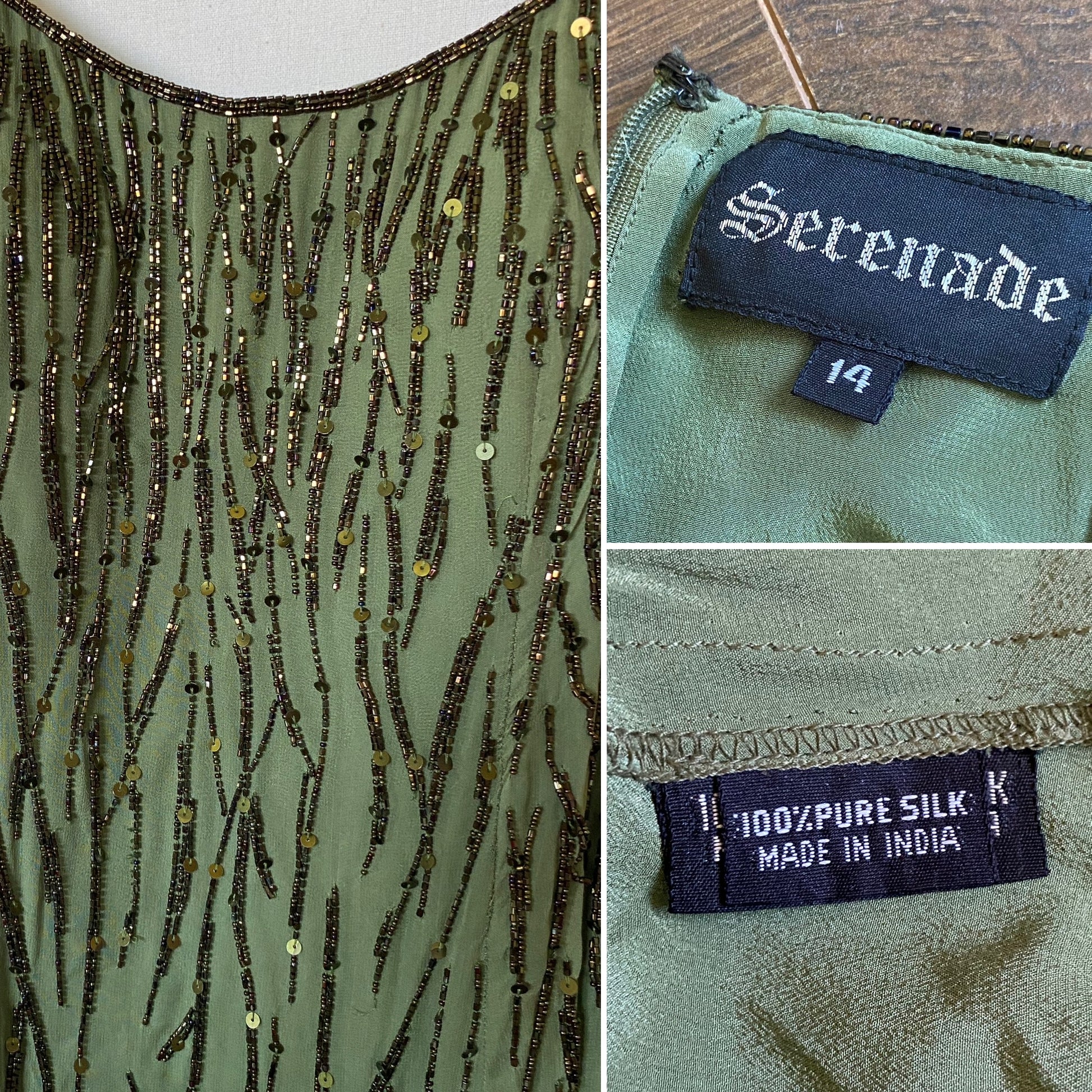 Green 100% silk beaded/sequin evening dress with a padded bust & a zip up the back uk 12