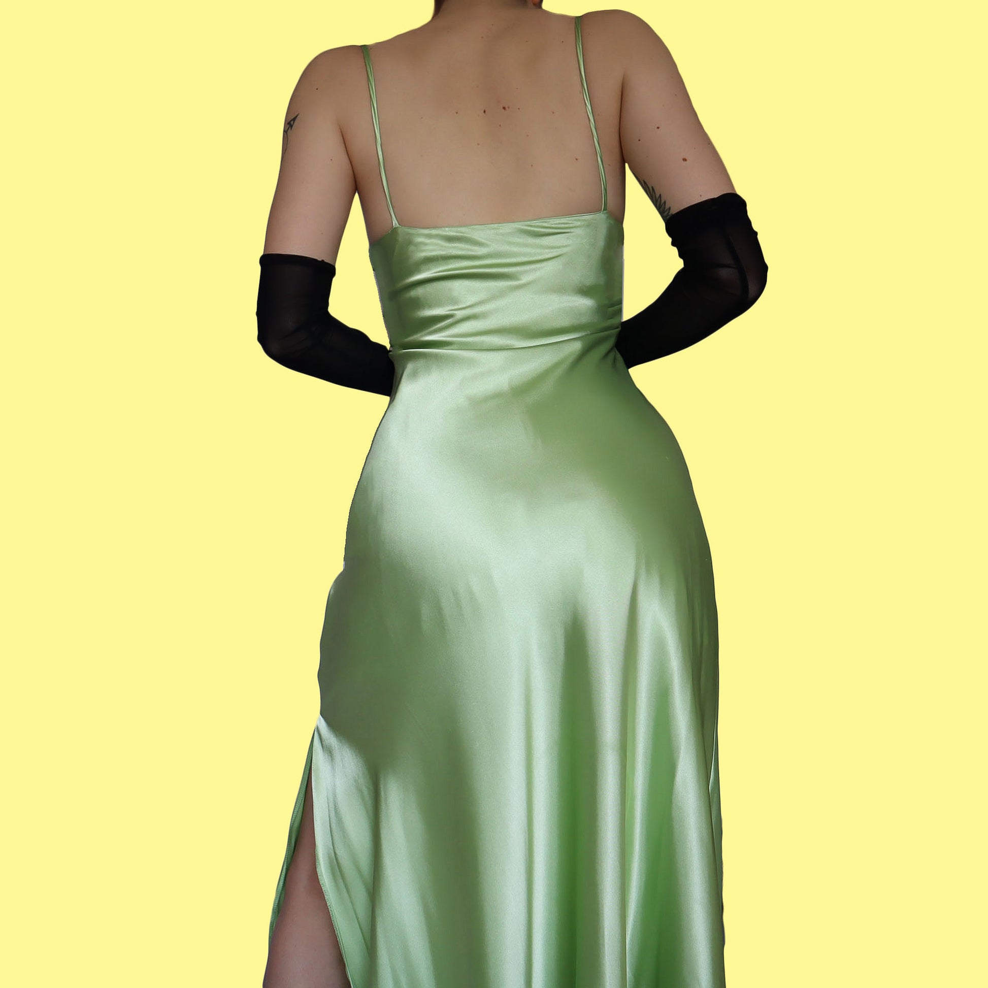 🌹Green satin evening dress with a lace, diamanté & bead detail bust, waist & hips - a slit down one side & a zip up one side UK 14