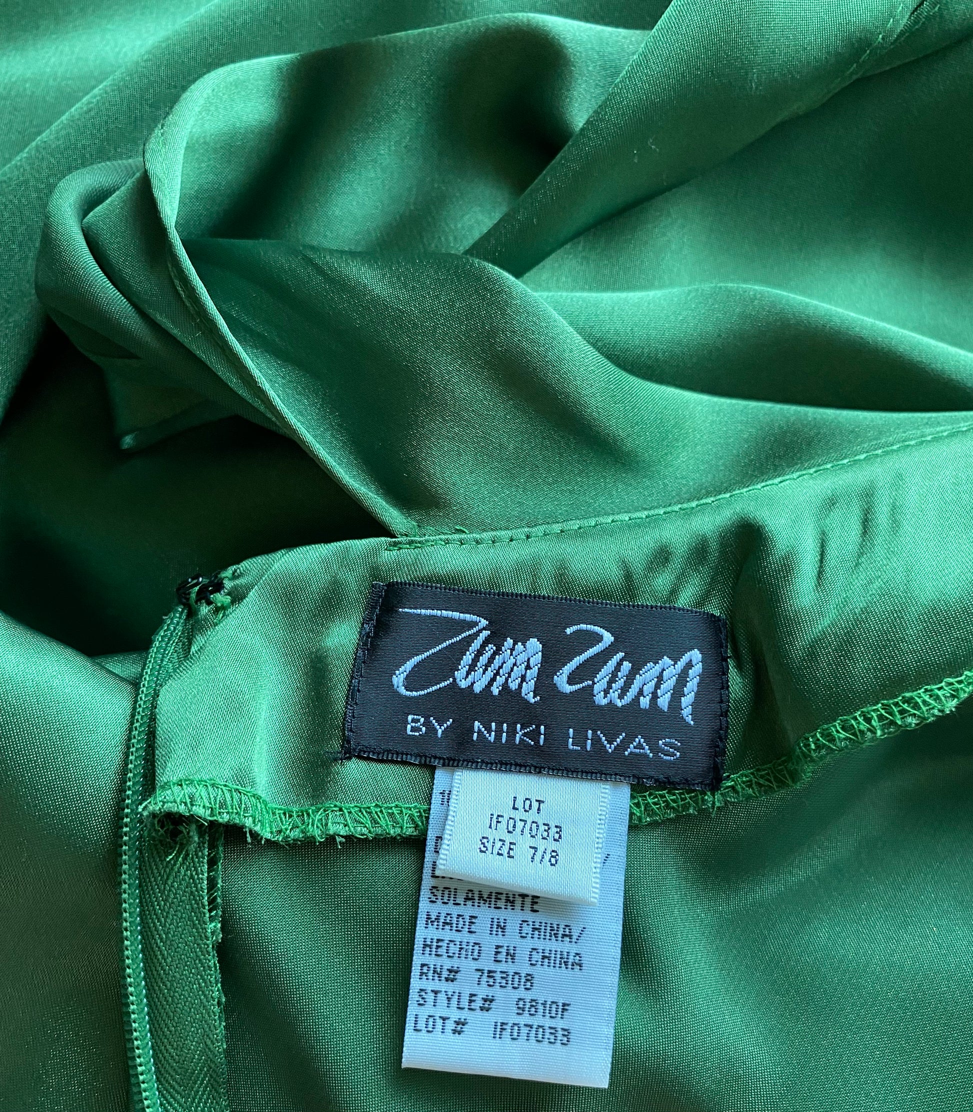 Green satin evening gown with a diamanté detail bust, hook & eye fastening at the back of the neck, a zip up the back & a tie around the waist UK 12