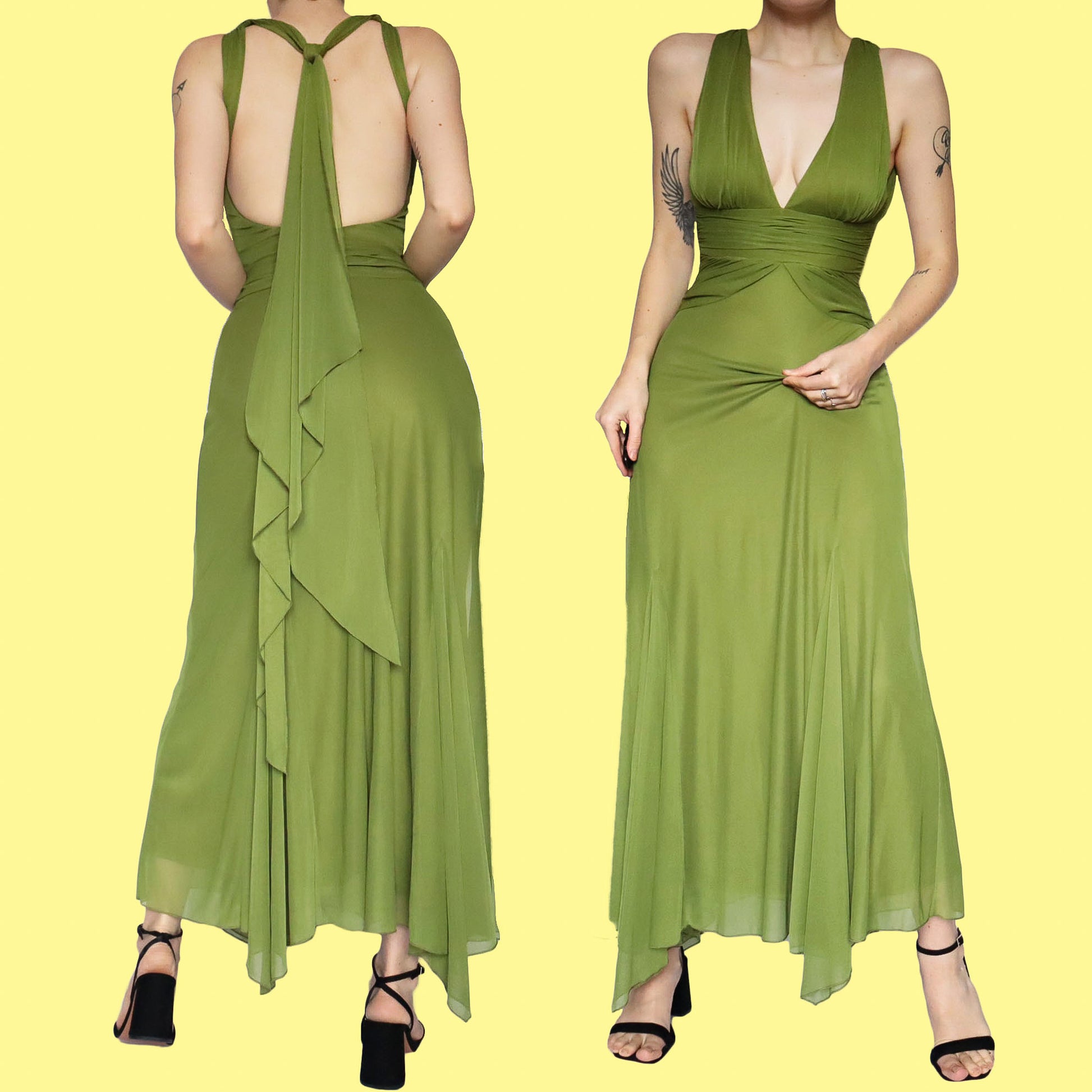 Green stretch open back evening dress UK 8