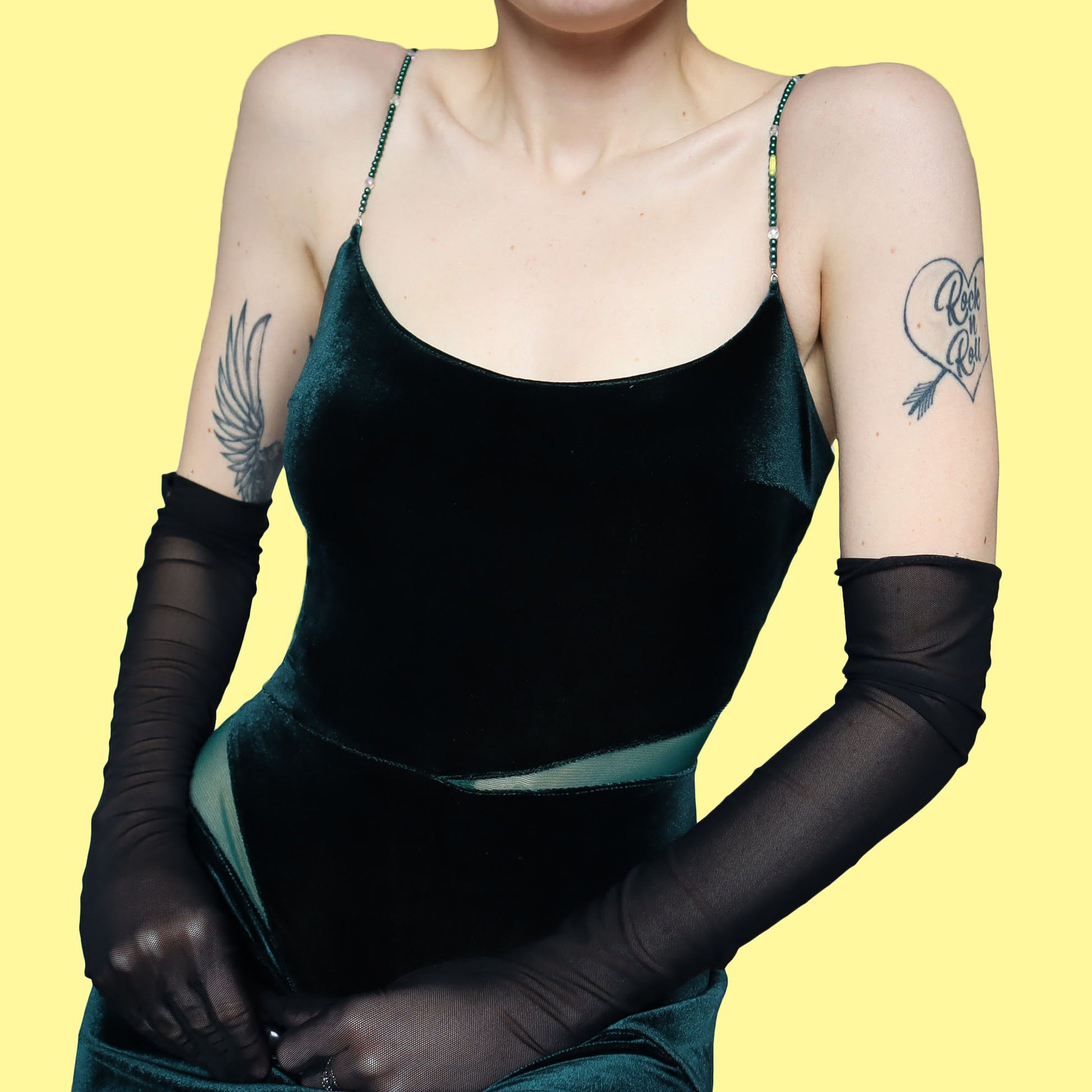 🌹Dark green velvet stretch evening dress with beaded straps, a padded bust & sheer cut outs UK 14🌹