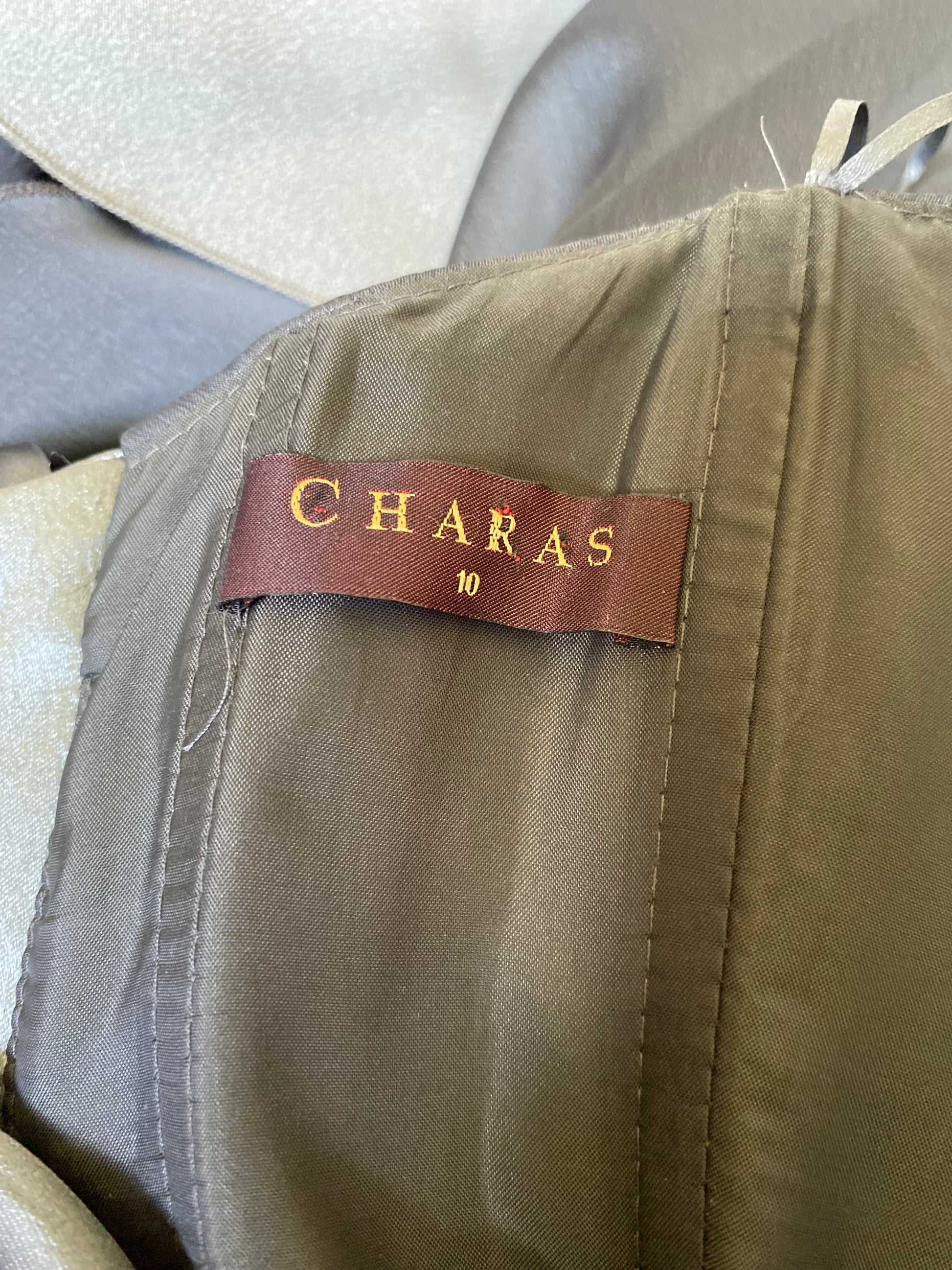 Grey strapless mini dress with a longer trail down the back, an adjustable lace up back, floral frill to the bust, a boned bust & waist & a zip up the back UK 8