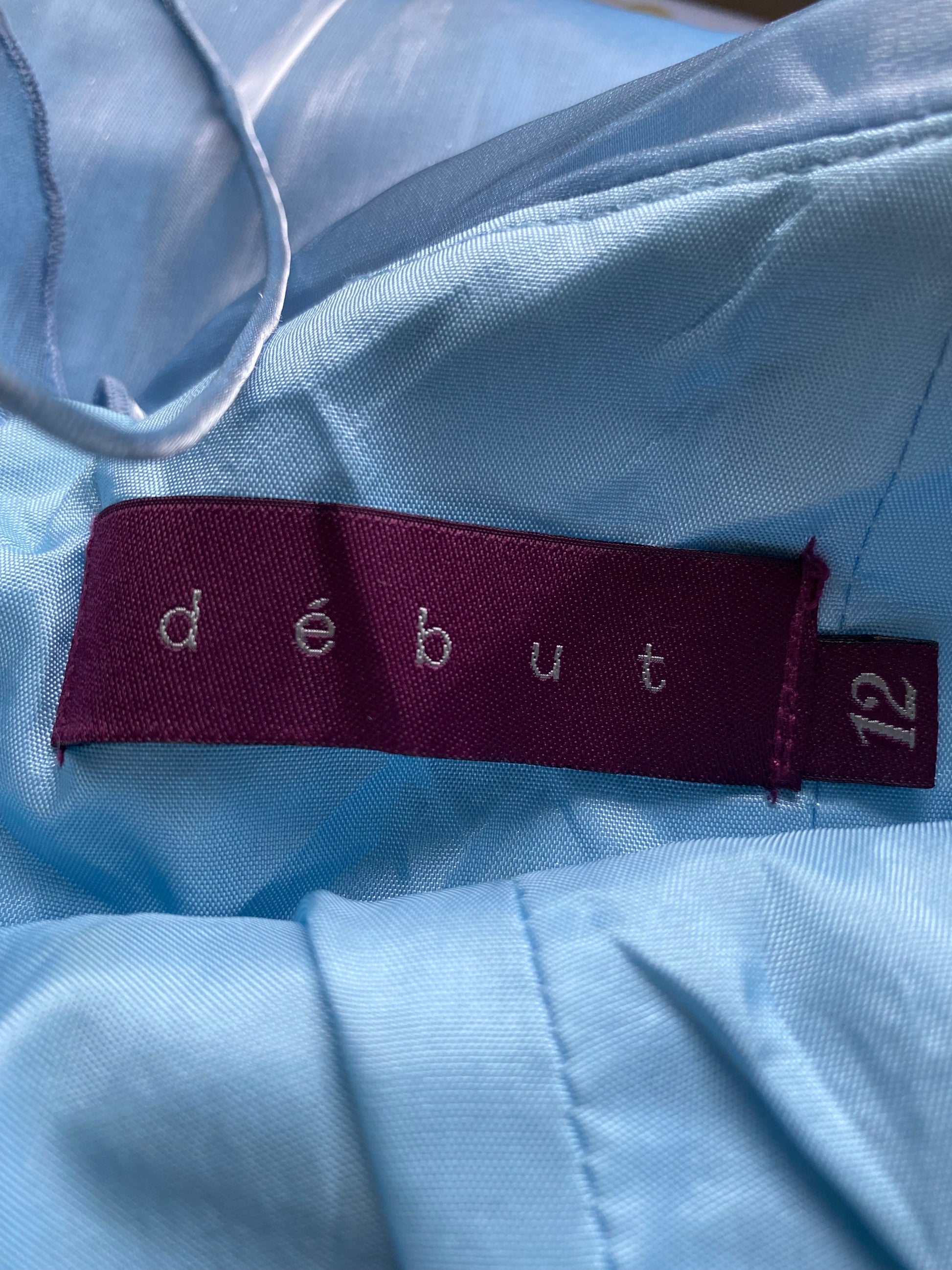Ice blue shimmery organza a-line gown with a tie at the back of the bust & a zip up the back UK 10-12