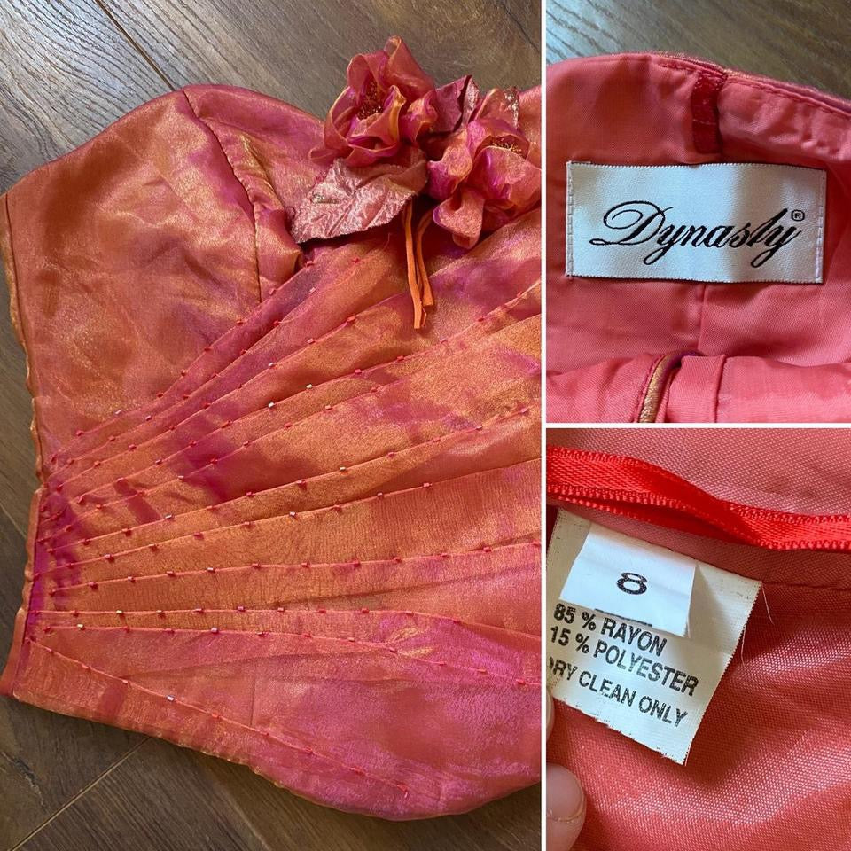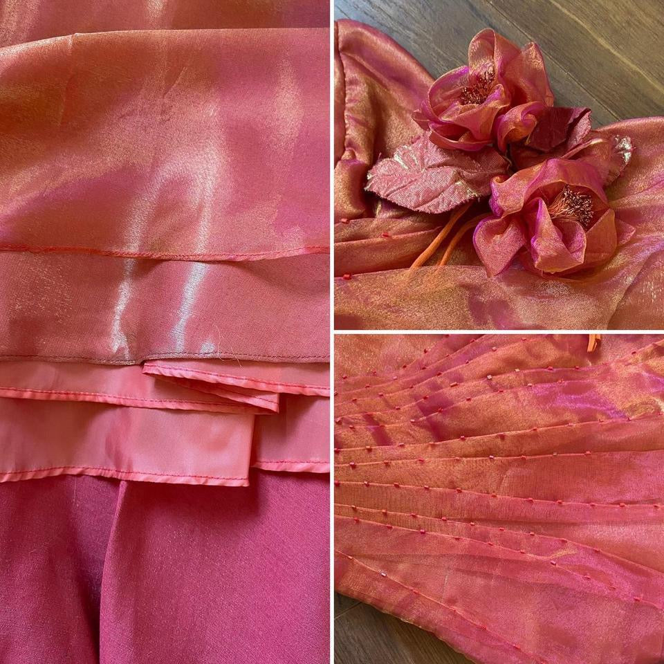 Iridescent orange 2 piece organza top & skirt - the top is strapless, with a thick almost thinly padded front with delicate beading & a zip up the back - the skirt is high waisted with a layered lining to hold the a-line shape & a zip up the back uk 8