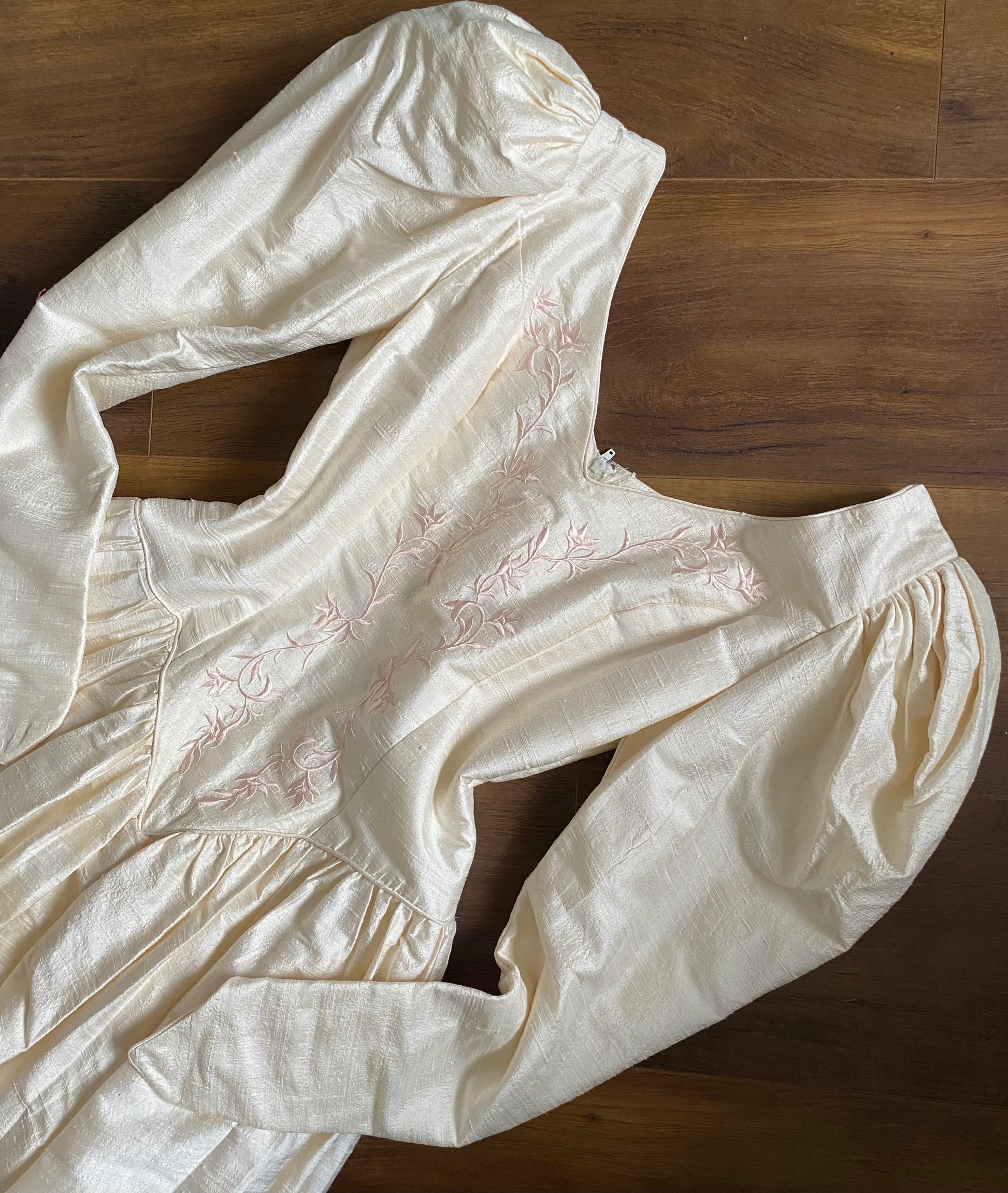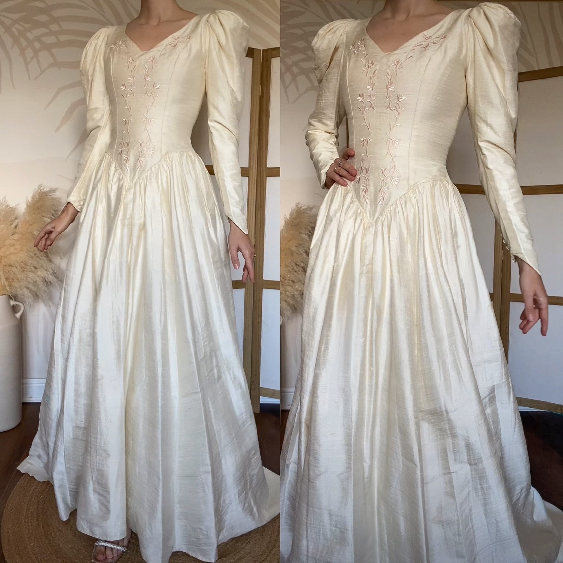 Luxury 80s 100% silk ivory wedding dress with long puff shoulder sleeves with button fastenings at the cuff, light pink embroidery down the front & back, a netted underlay to hold the shape of the dress, a longer train down the back, a cute bow detail which has a popper fastening to one side, decorative buttons down the back & a zip up the back uk 10