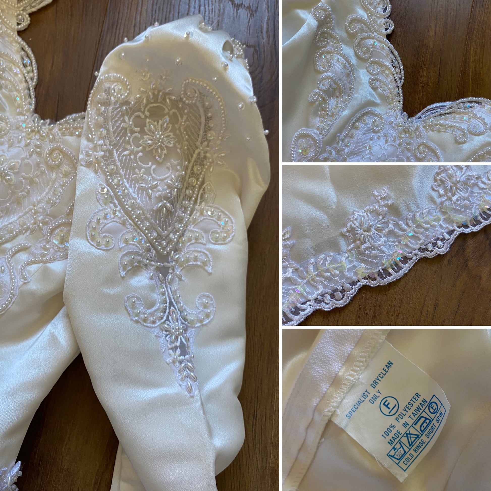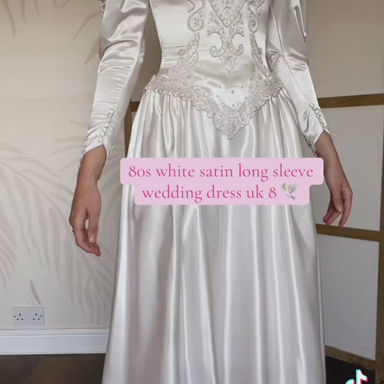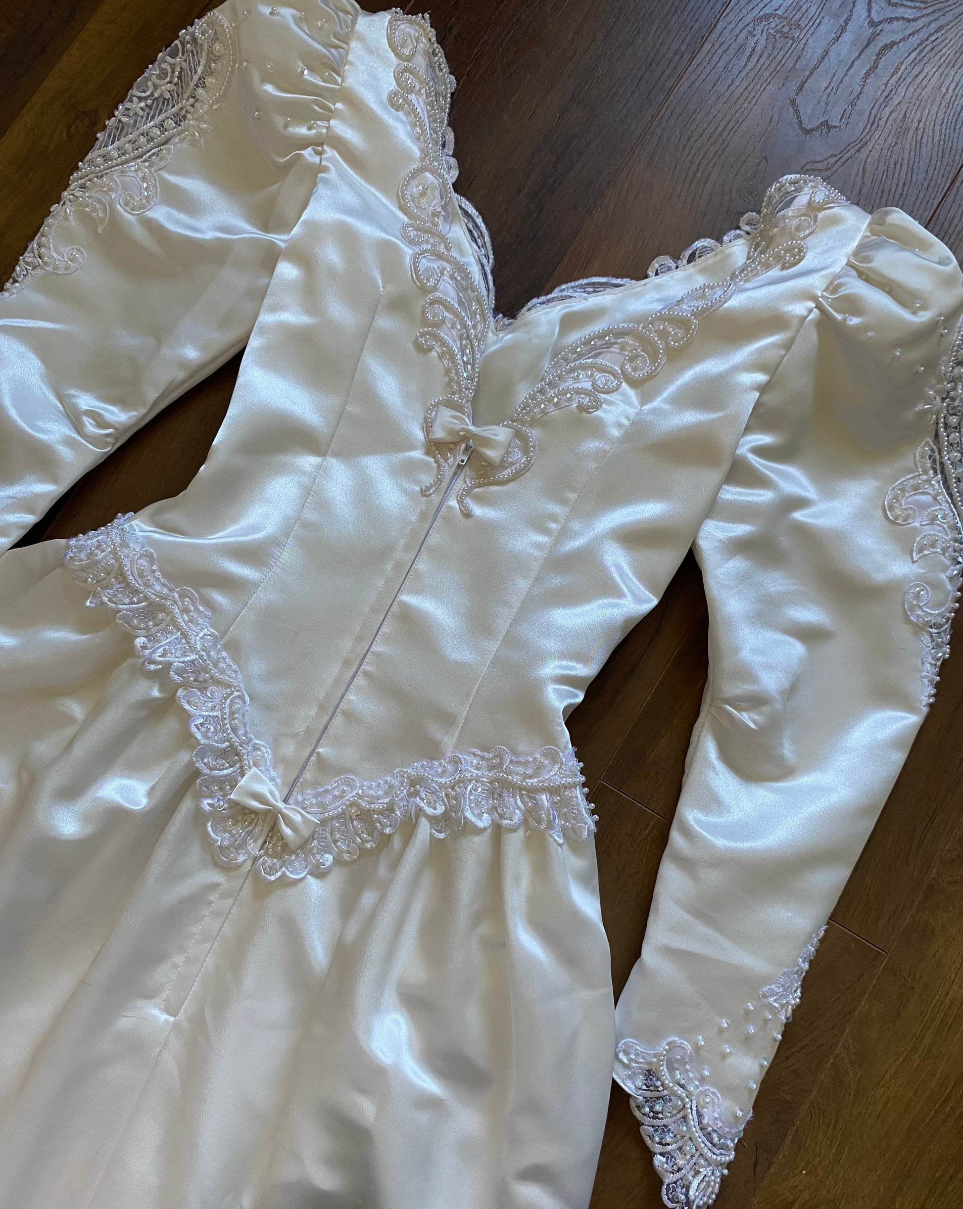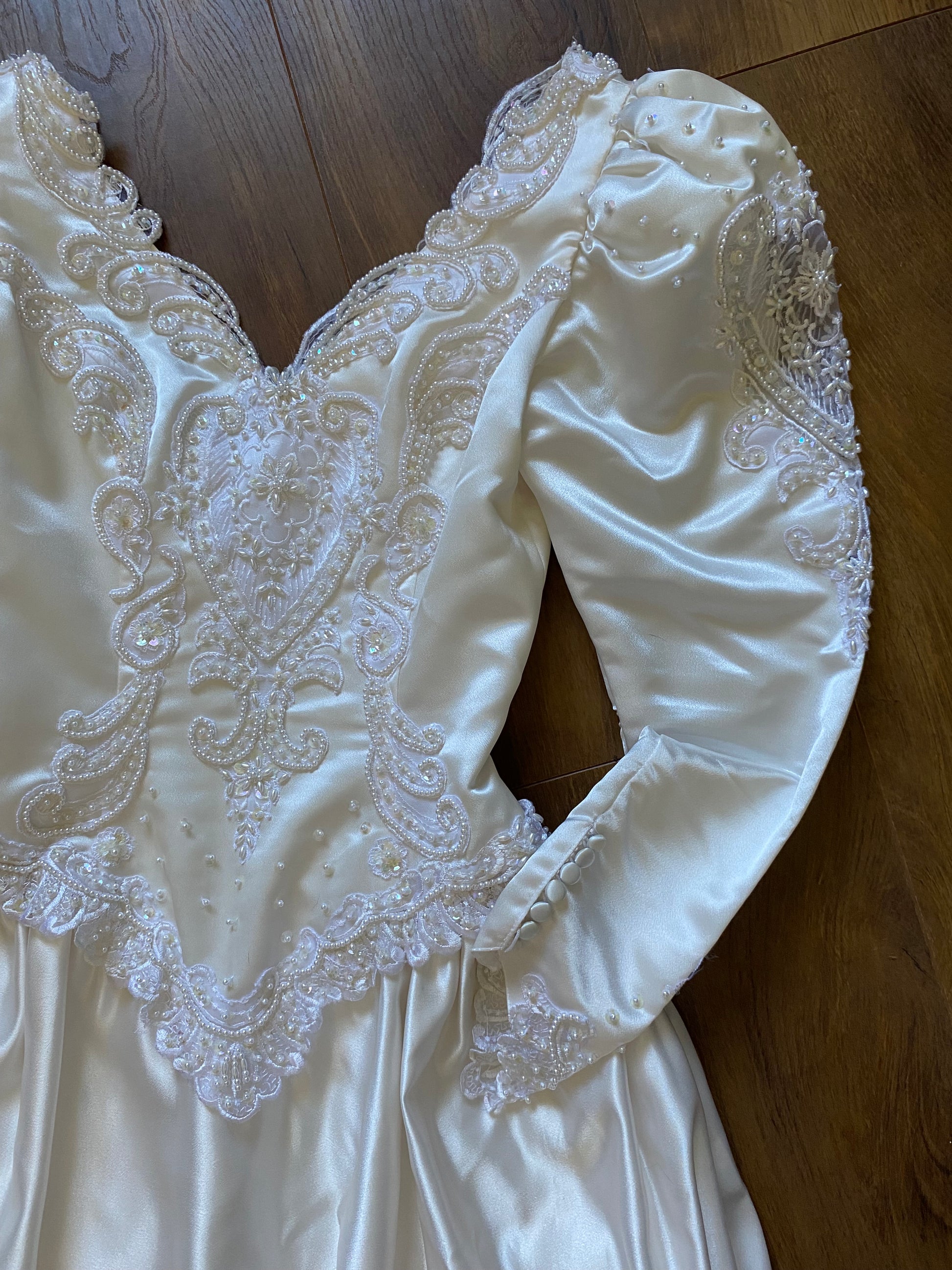 Vintage 80s silky ivory wedding dress with long sleeves, shoulder pads, pearl & sequin lace detailing, buttoned cuffs & a zip up the back uk 8
