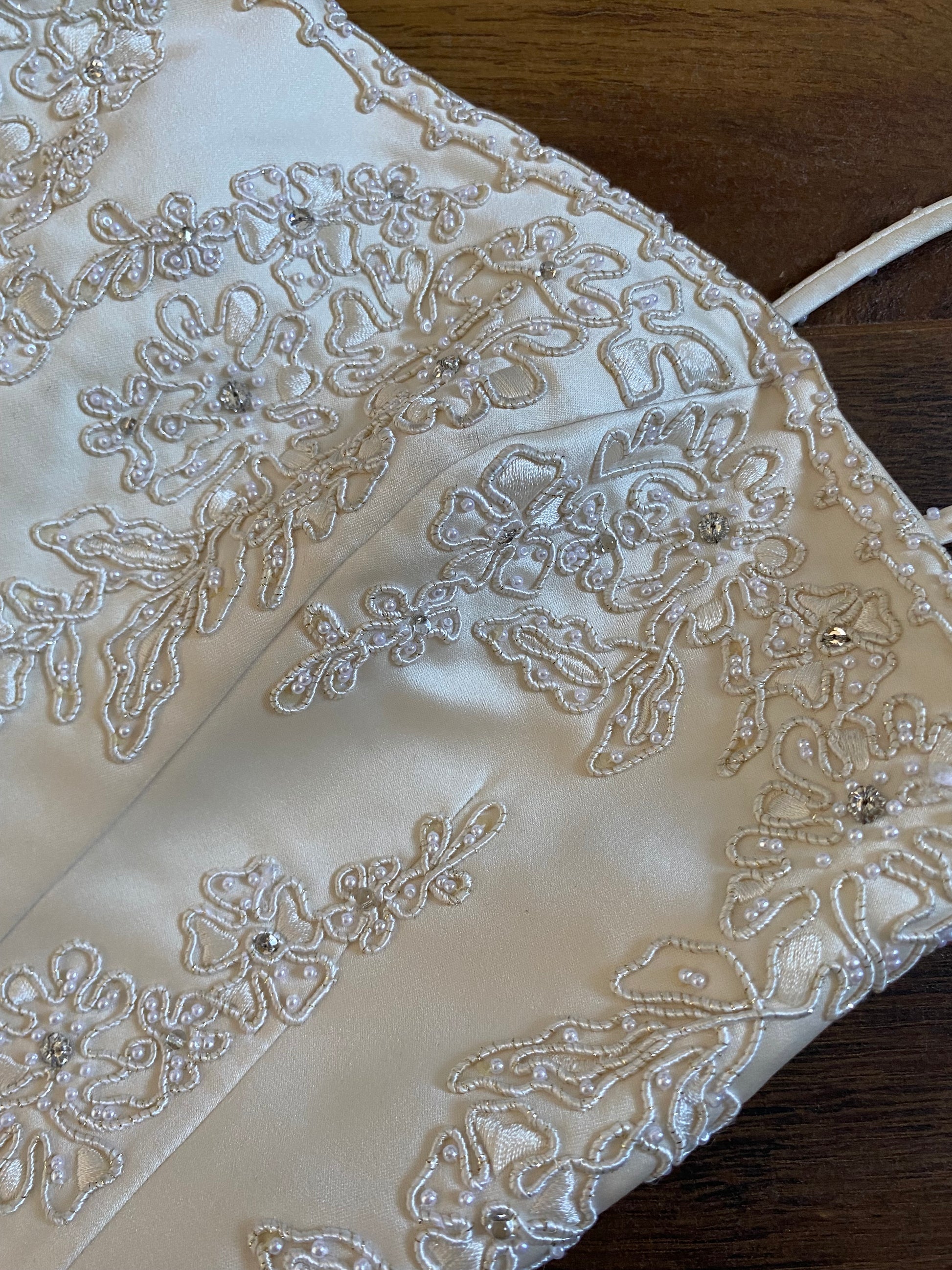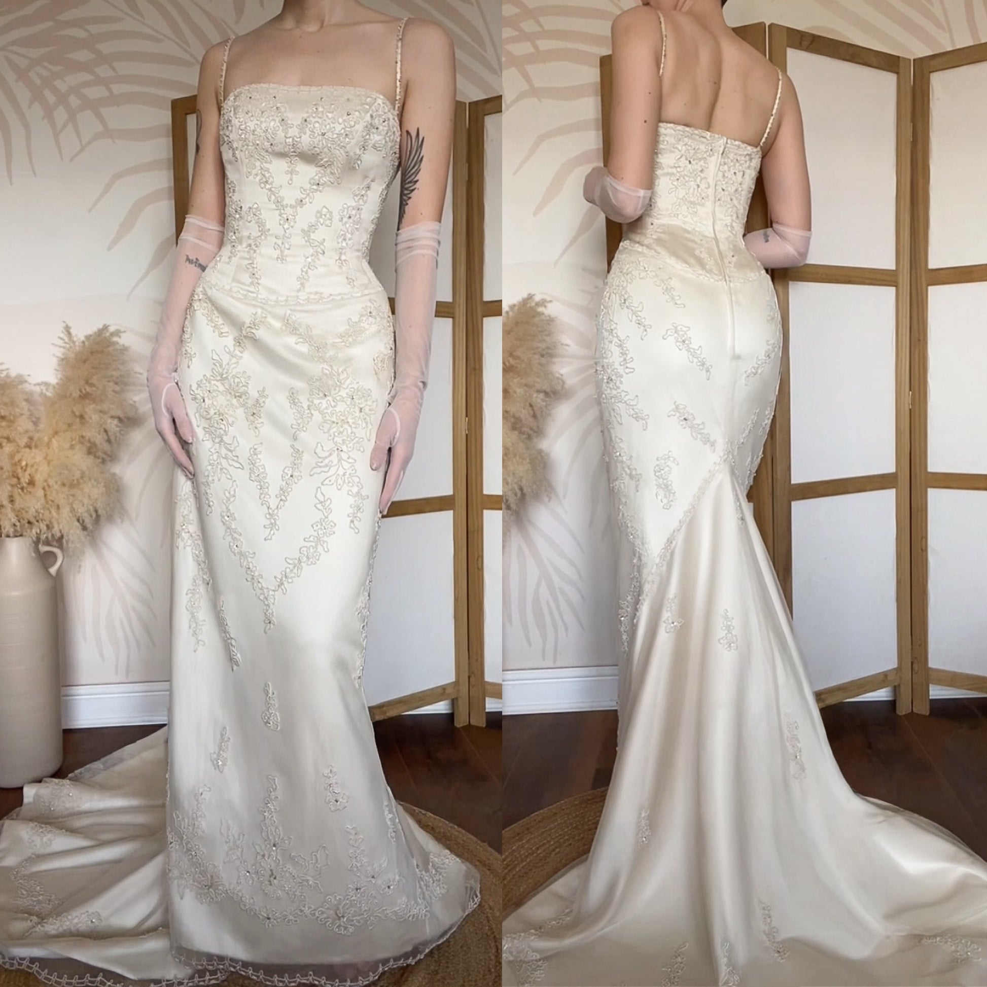 Ivory Benjamin Roberts wedding dress with lace/Pearl and sequin detailing, a boned bodice, a longer train down the back, straps which can be detached at the back via a popper and tucked in if you want it strapless & a zip up the back uk 12