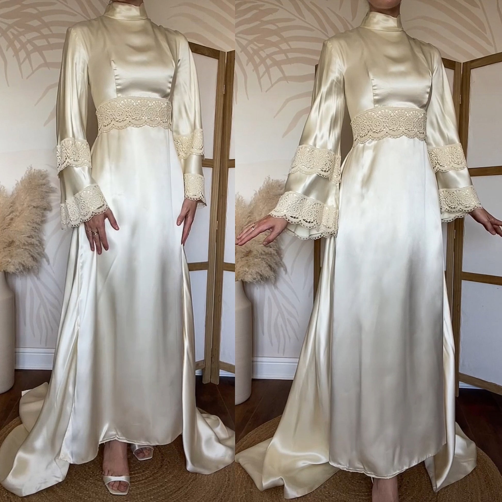 Ivory beautiful 70s heavy satin long sleeve wedding dress with lace detailing around the waist & sleeves, flared sleeves, a high neckline, a-line shape with a longer train down the back & a zip up the back uk 12