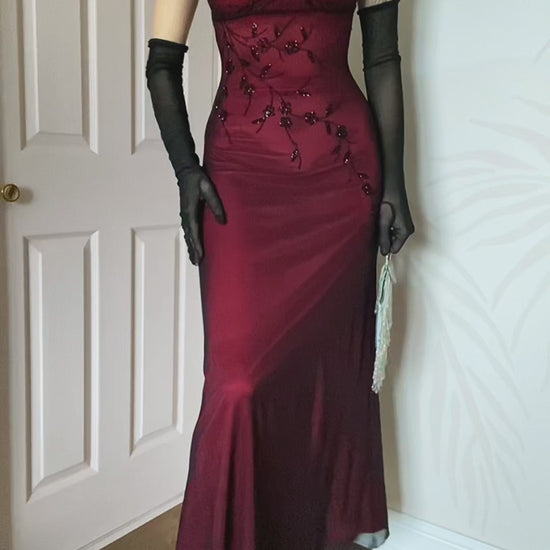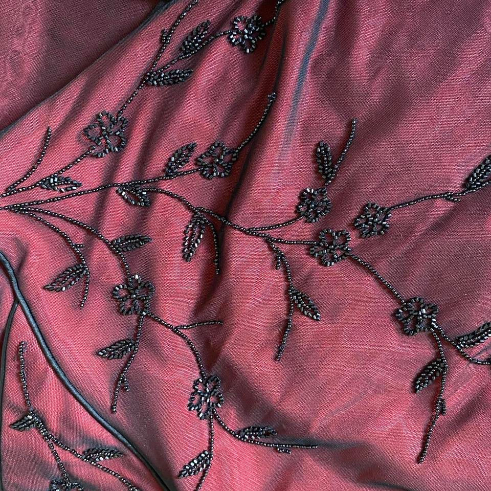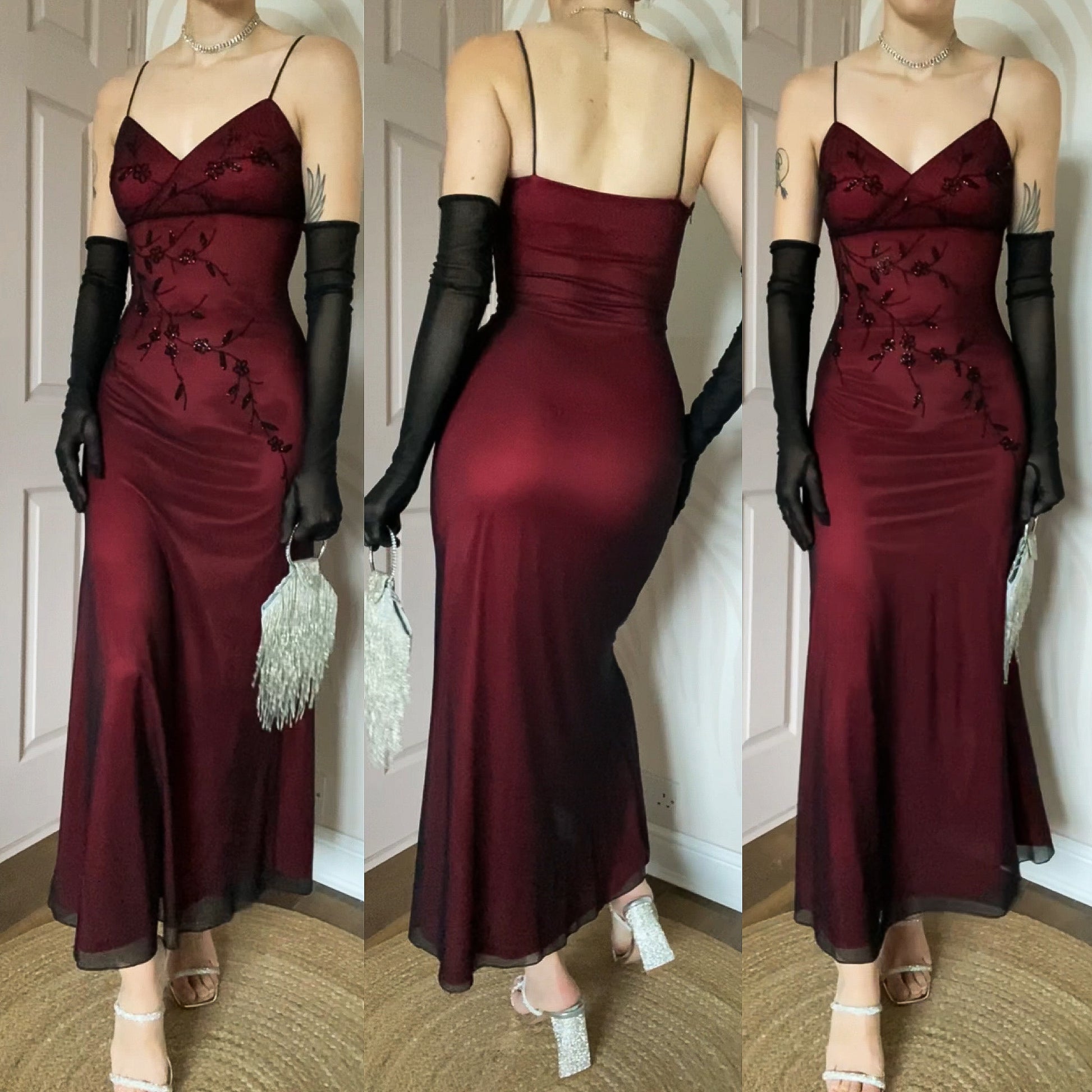 🌹Red slip evening dress UK 10🌹Beautiful red stretch evening maxi dress with sheer black overlay, bead detailing to the bust & waist & a zip up the side🌹