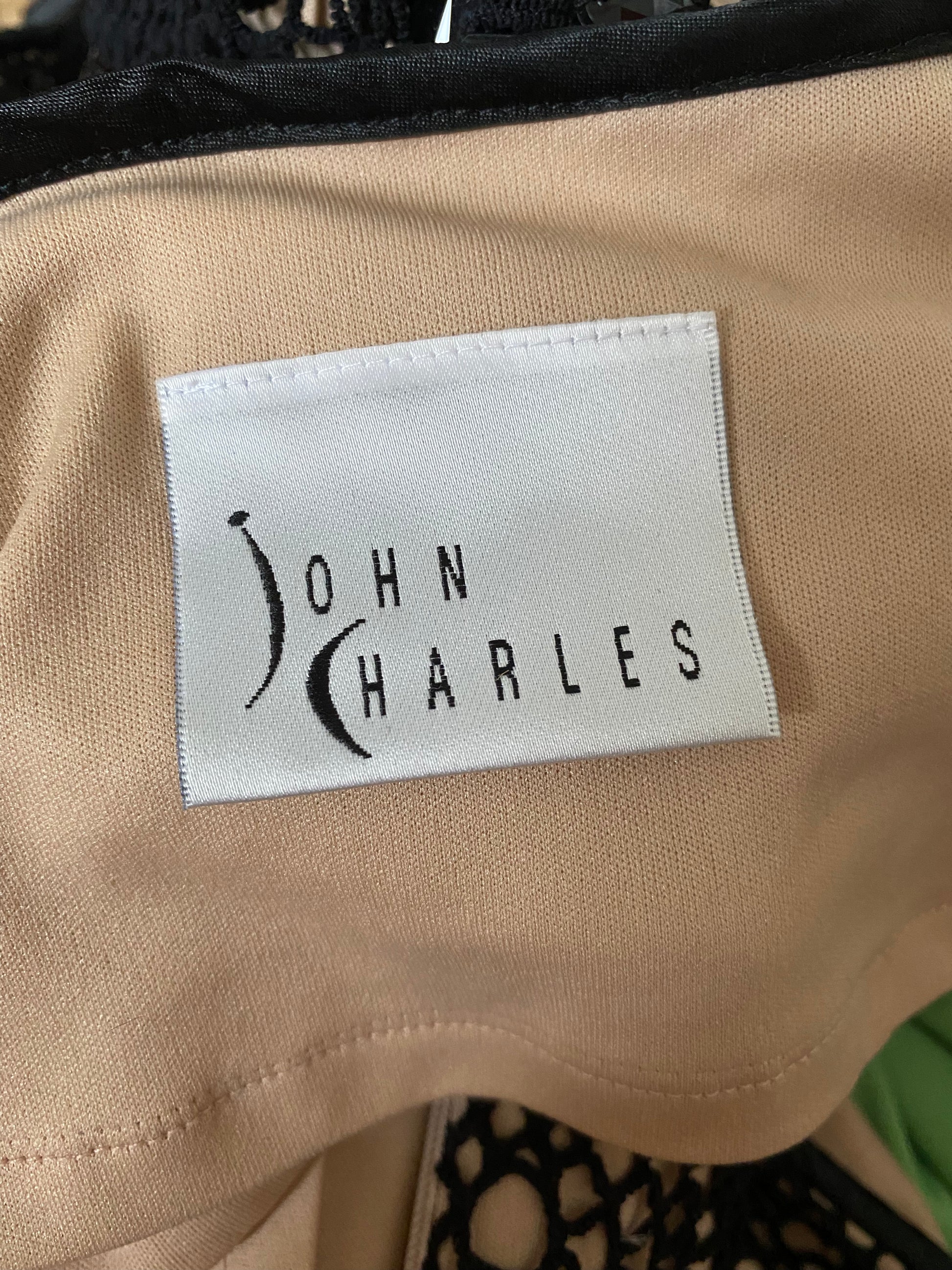 🌹Black net stretch evening dress with a tan stretch lining showing through, black gem detailing, a padded bust, cross over straps & a zip up the side UK 12🌹