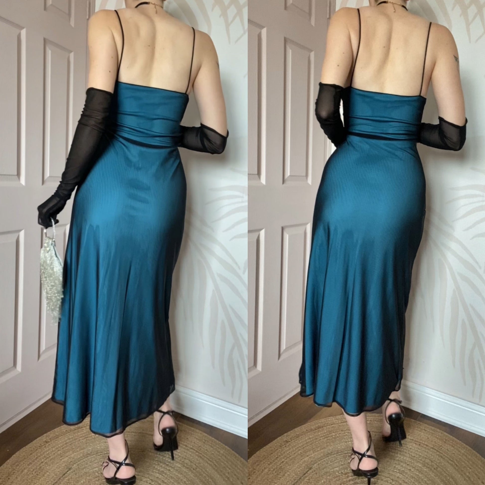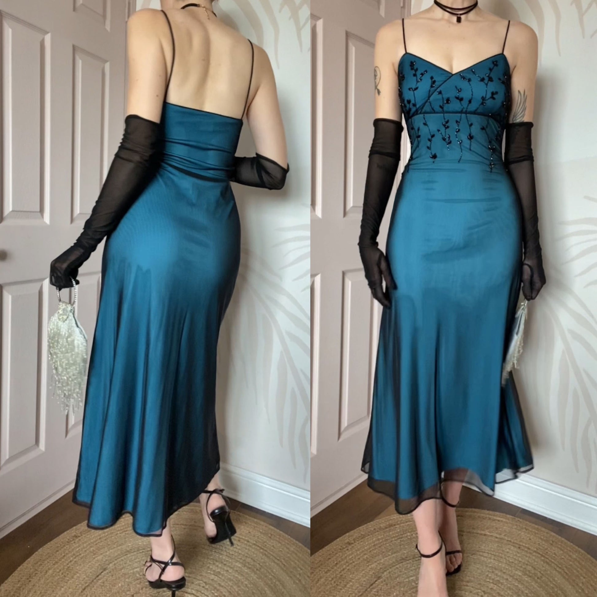Blue stretch evening dress with a sheer black overlay, bead detailing & a zip up the side UK 14