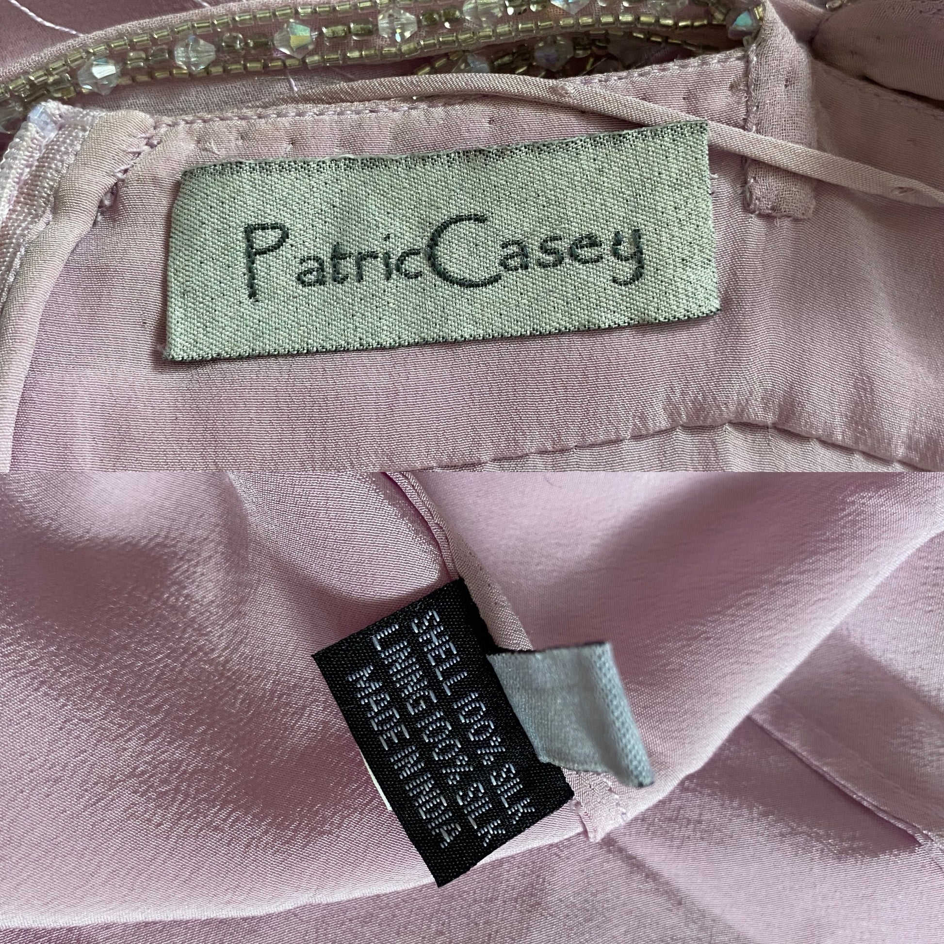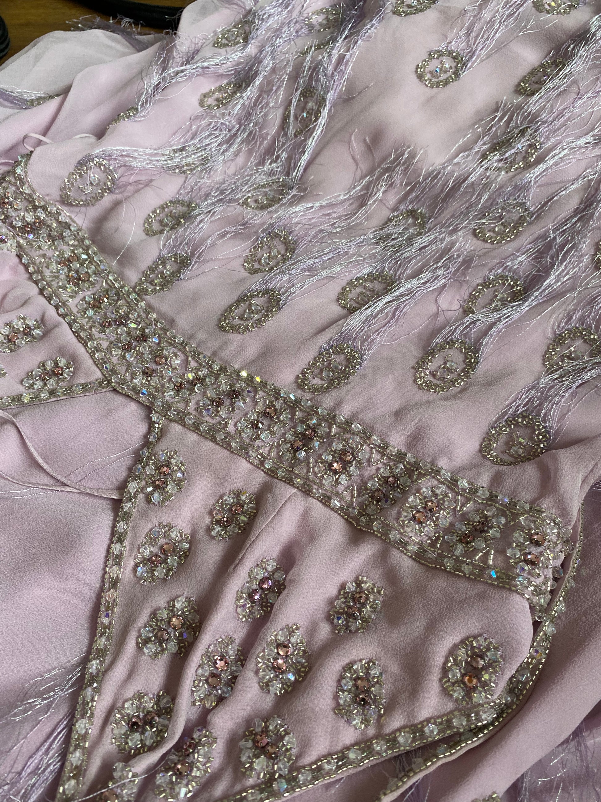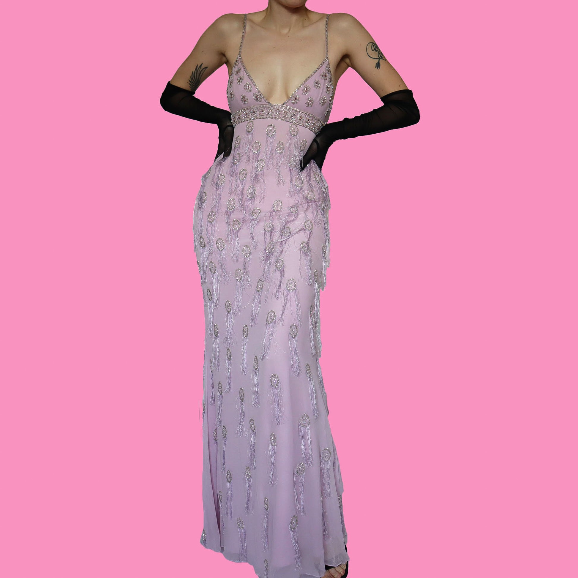 Lilac 100% silk evening gown with low cut bust, beaded & fringe detailing & a zip up the back UK 10
