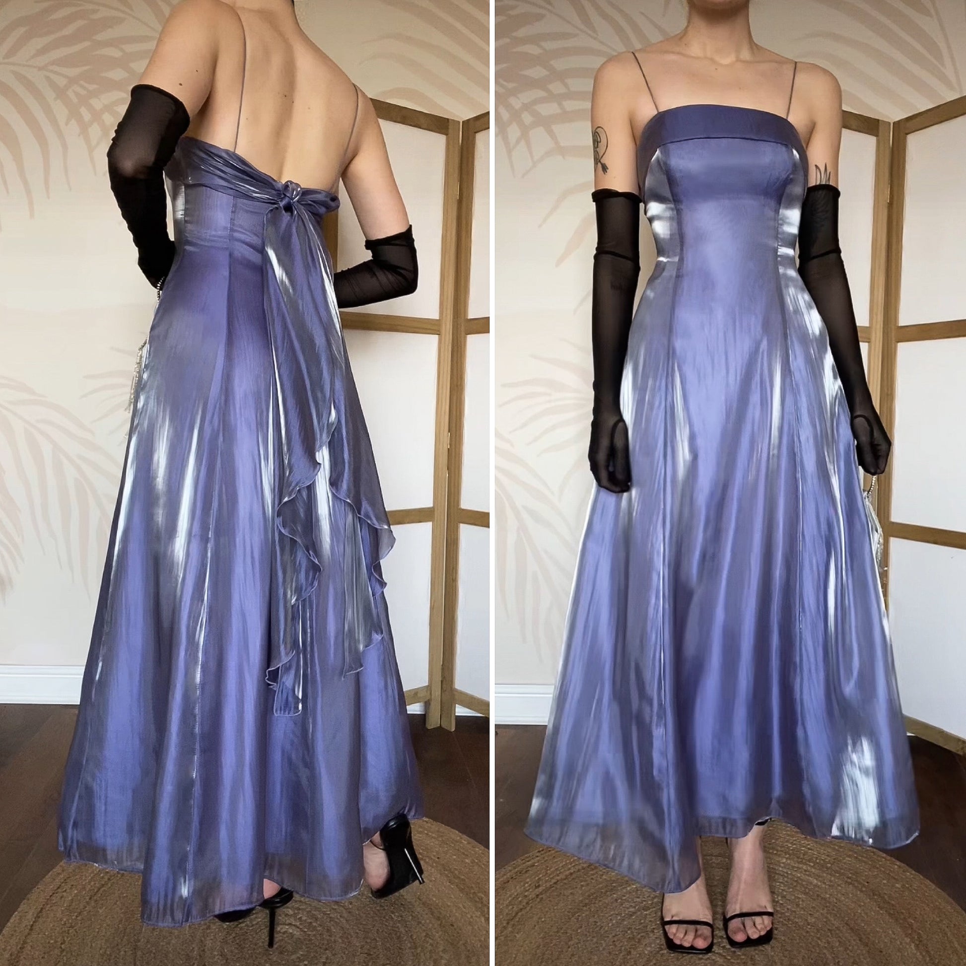 Silky purple a-line prom dress with a netted underlay to hold the shape of the dress, a tie at the back of the dress & a zip up the back UK 10