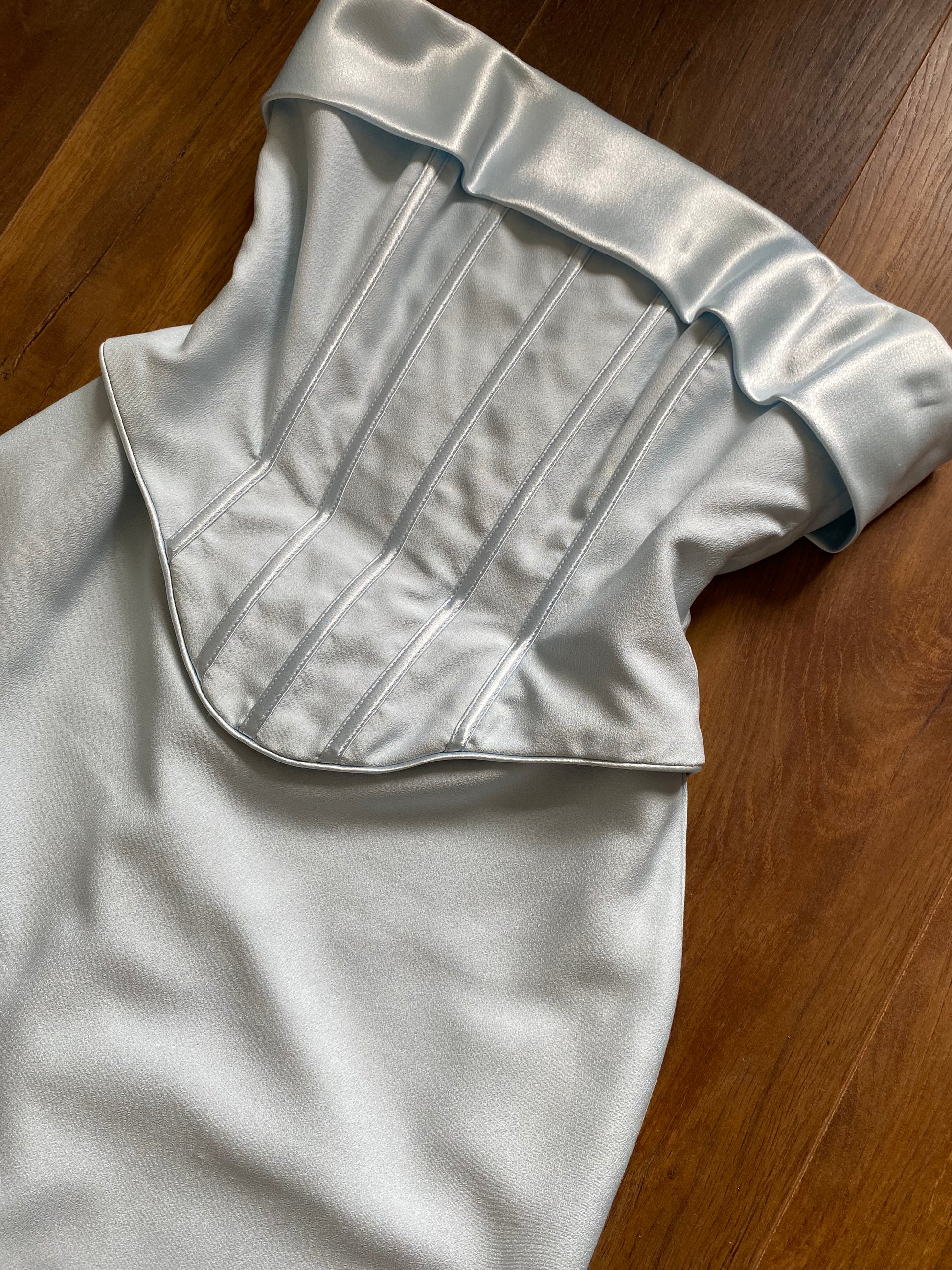 Icy blue strapless corset style evening dress with a boned bust & waist, decorative buttons down the back, a zip up the back & a matching chiffon shawl uk 12