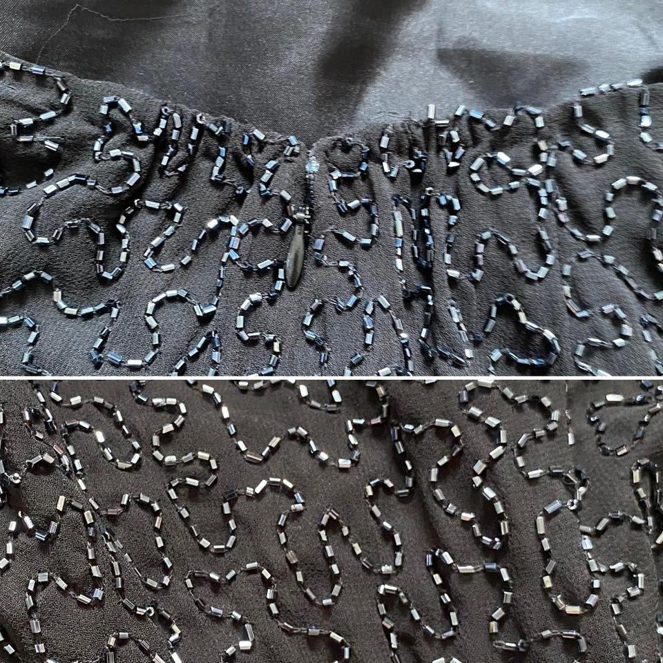 Black beaded evening dress with a bright coral lining, a slit up one side, cross over straps with a hook & eye & popper fastenings & a zip up the back uk 8