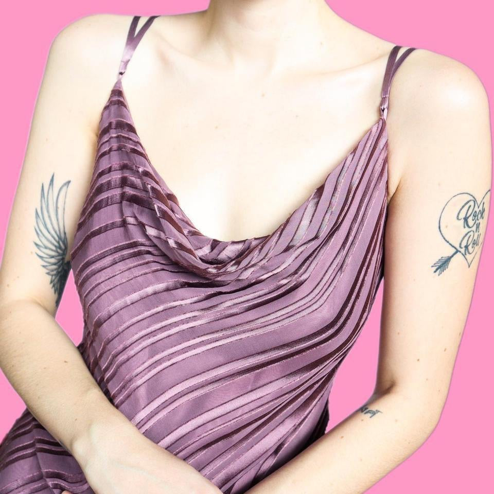 🌹Beautiful 40% silk blend purple stripe pattern slip dress with cowl neckline UK 8🌹