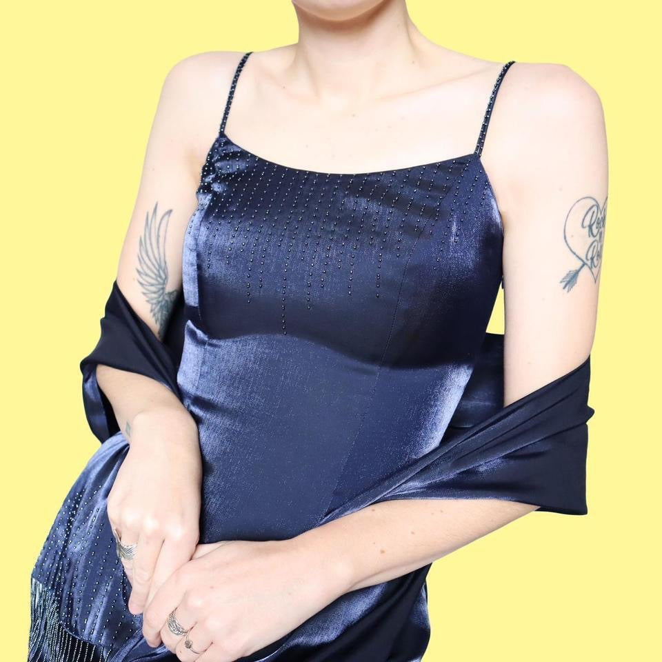 🌹Navy evening dress with matching shawl UK 12 & UK 16🌹Stunning silky navy a line evening dress with beaded bust & matching beaded shawl, a lace up back & a zip up the side🌹