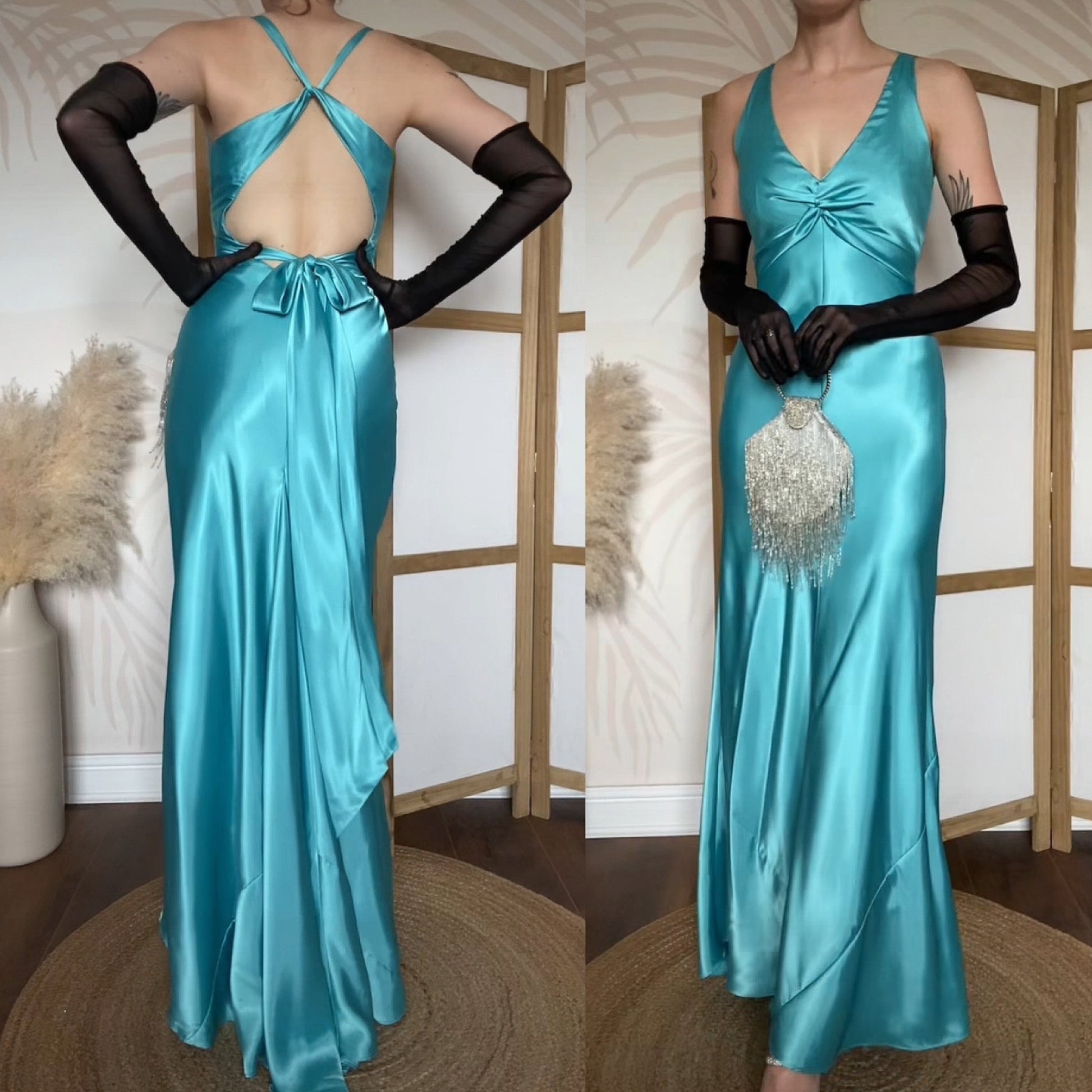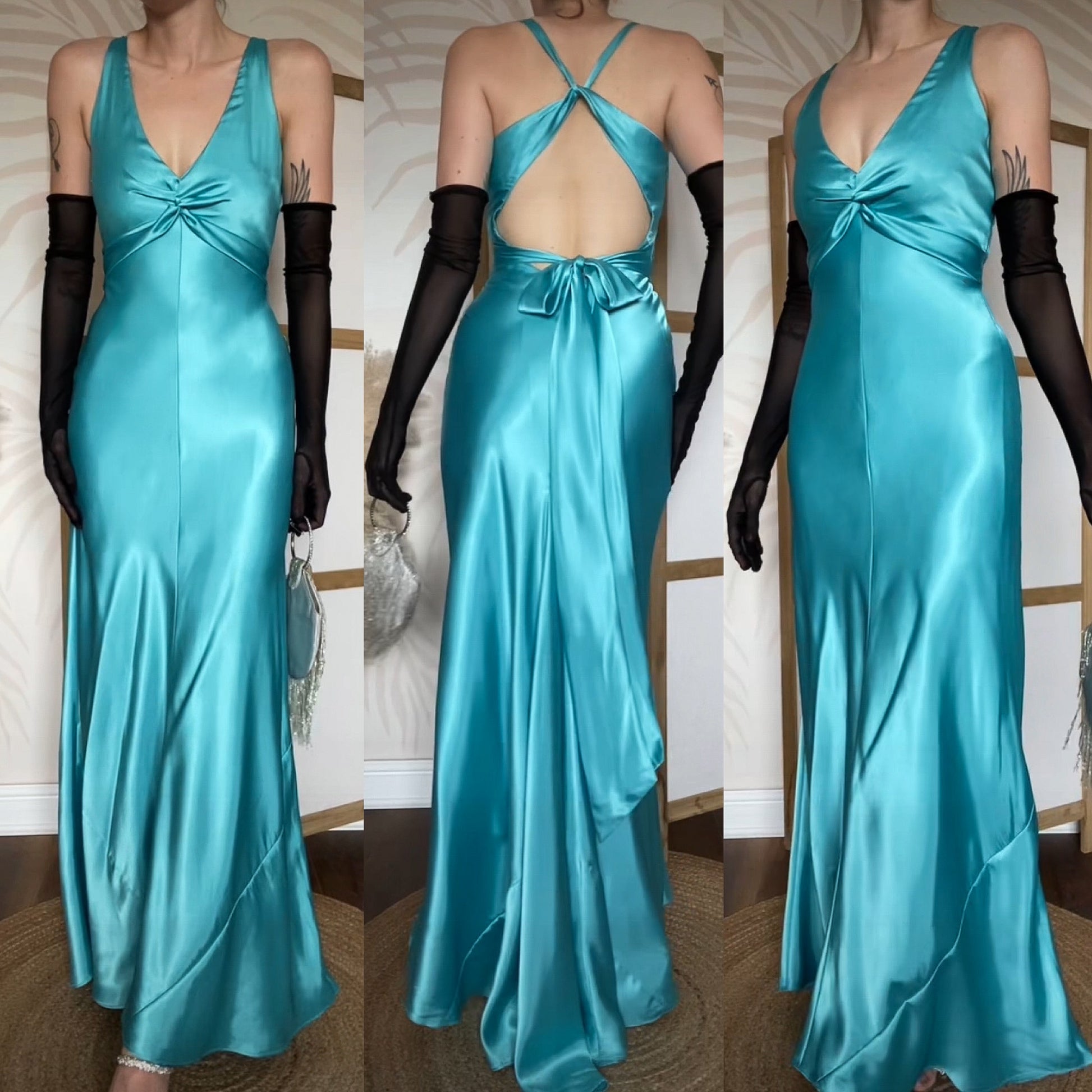 Sapphire satin evening dress with a longer train at the back, cross over straps, a tie around the waist & a zip up the back uk 8