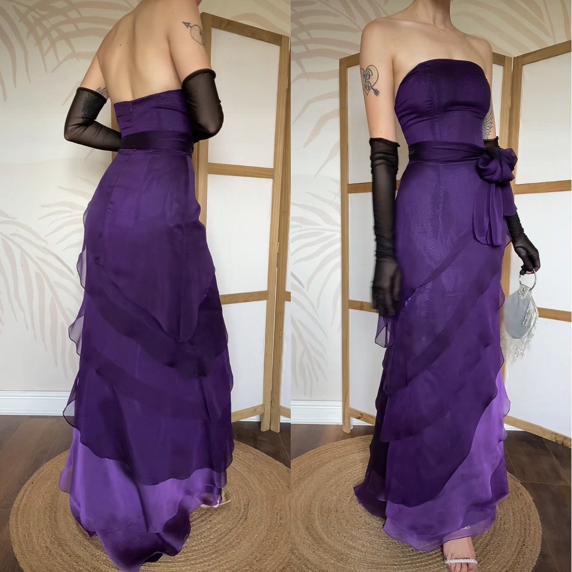 Purple strapless layered chiffon evening dress with a netted underlay to flare out the bottom hem, a slightly longer train down the back, a boned bust & waist & matching shawl which can also be used as a tie around the waist (as shown in photos) uk 12