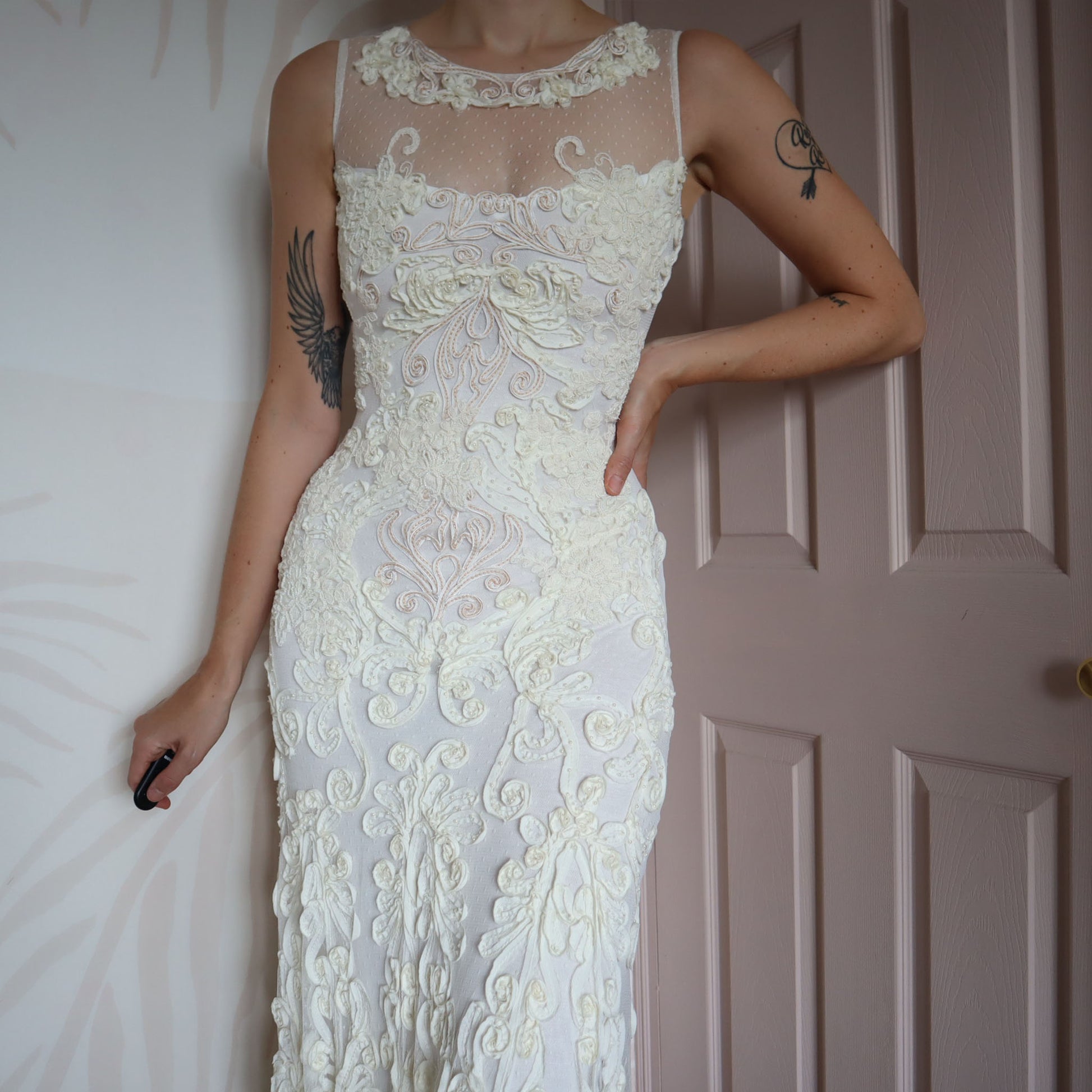 Beautiful off white lace detail stretch wedding dress with bead detailing, a sheer bust & back, a jersey stretch lining & a zip up one side UK 10