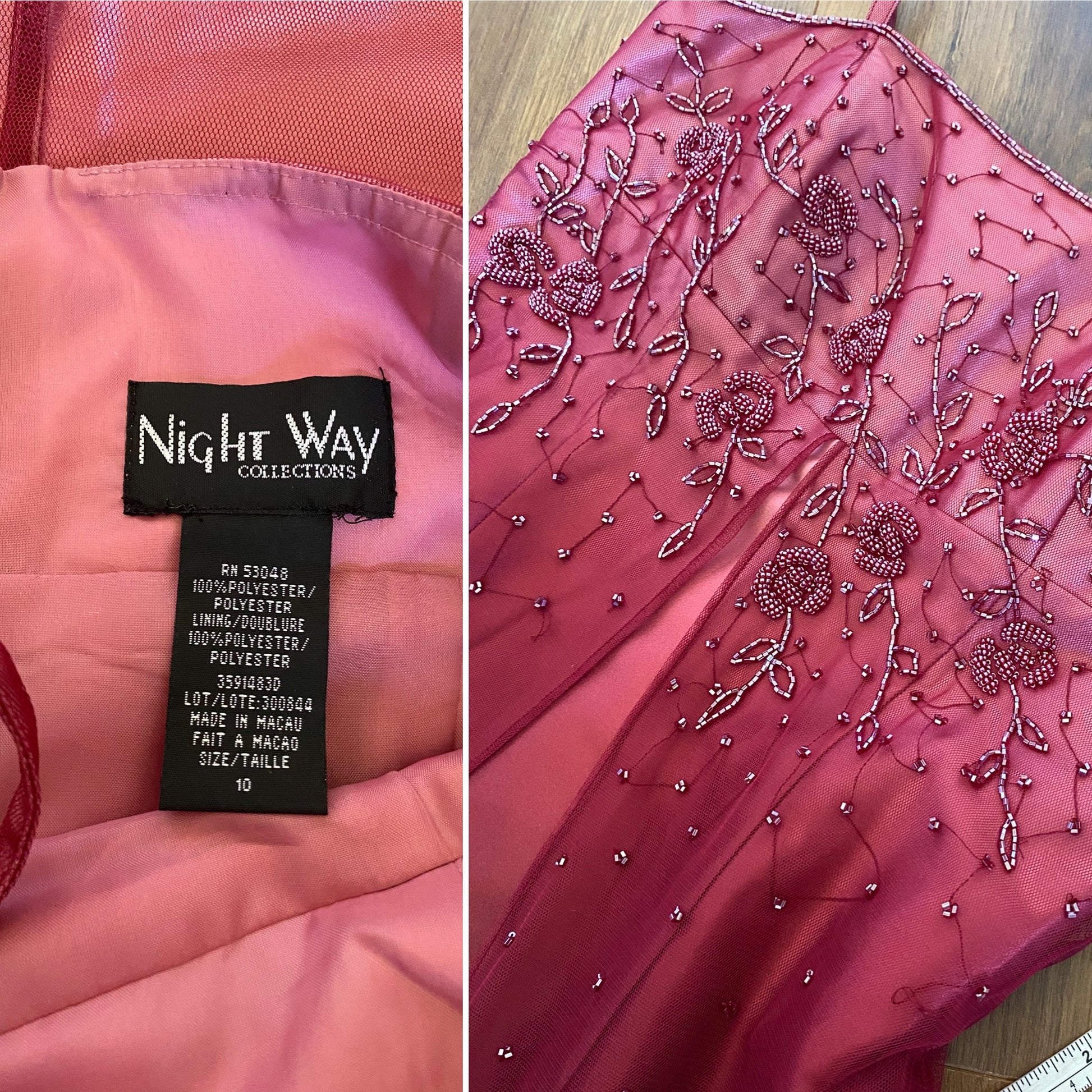 Beautiful pink & red ombré satin evening dress with sheer beaded overlay, a padded bust & a zip up the back UK 10