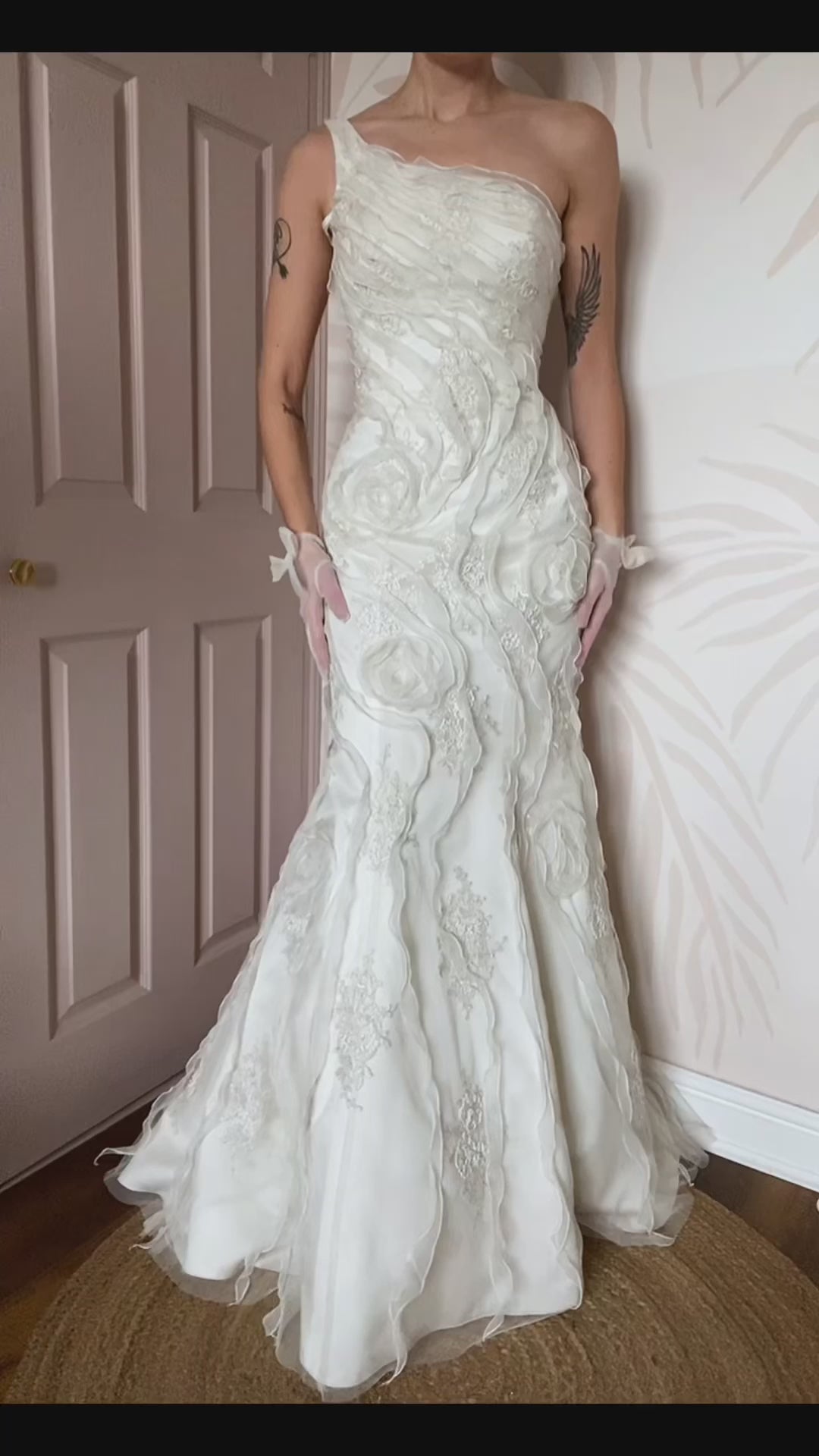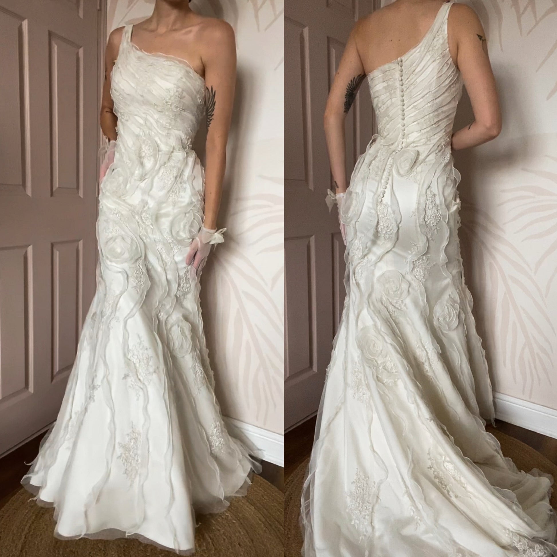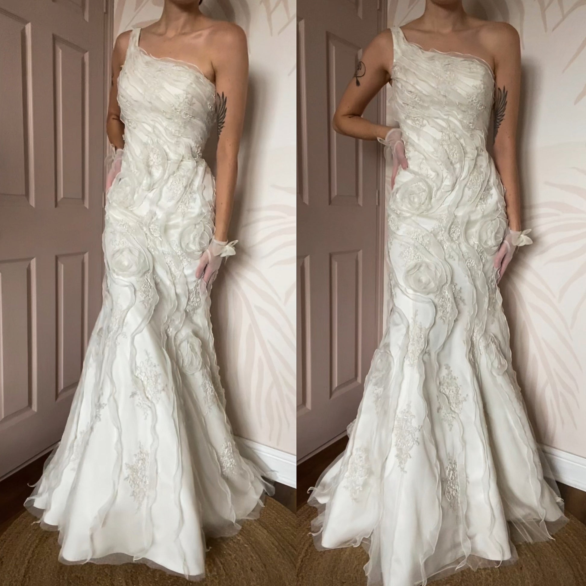 Off white one shoulder wedding dress with beautiful frilly fabric detailing, embroidery & lace - a padded boned structured inside with a elastic waist corset that keeps the dress in place - the dress has a fishtail hem & long trail with a netted underskirt to hold the shape of the dress - button detailing down the back & a zip up the back UK 12
