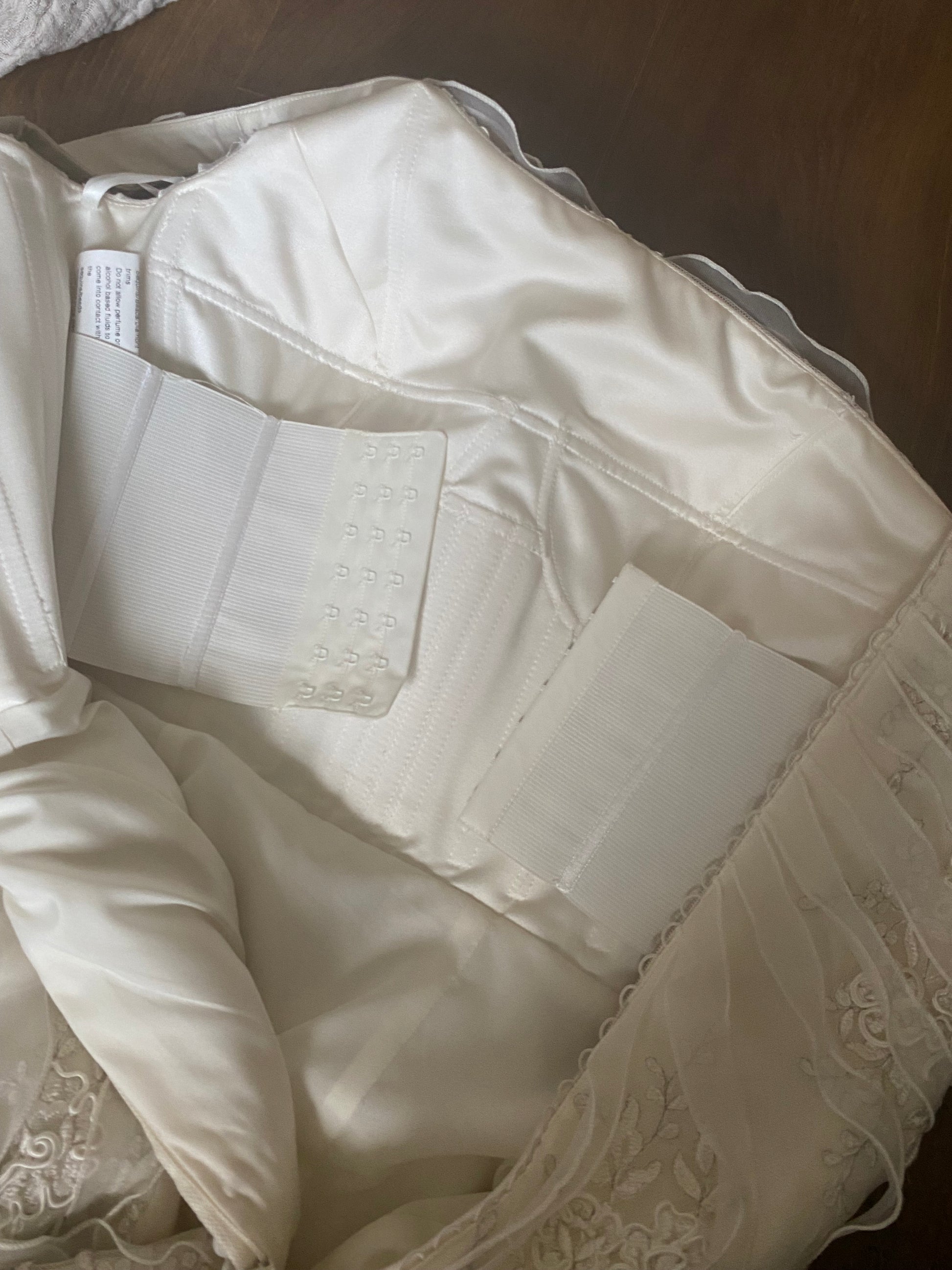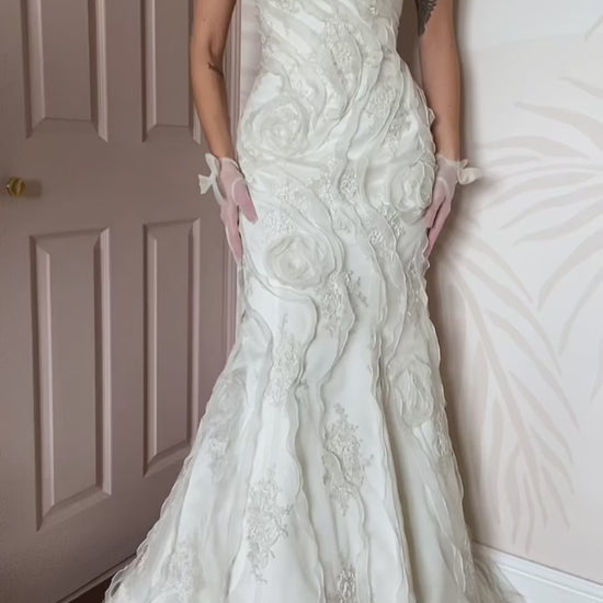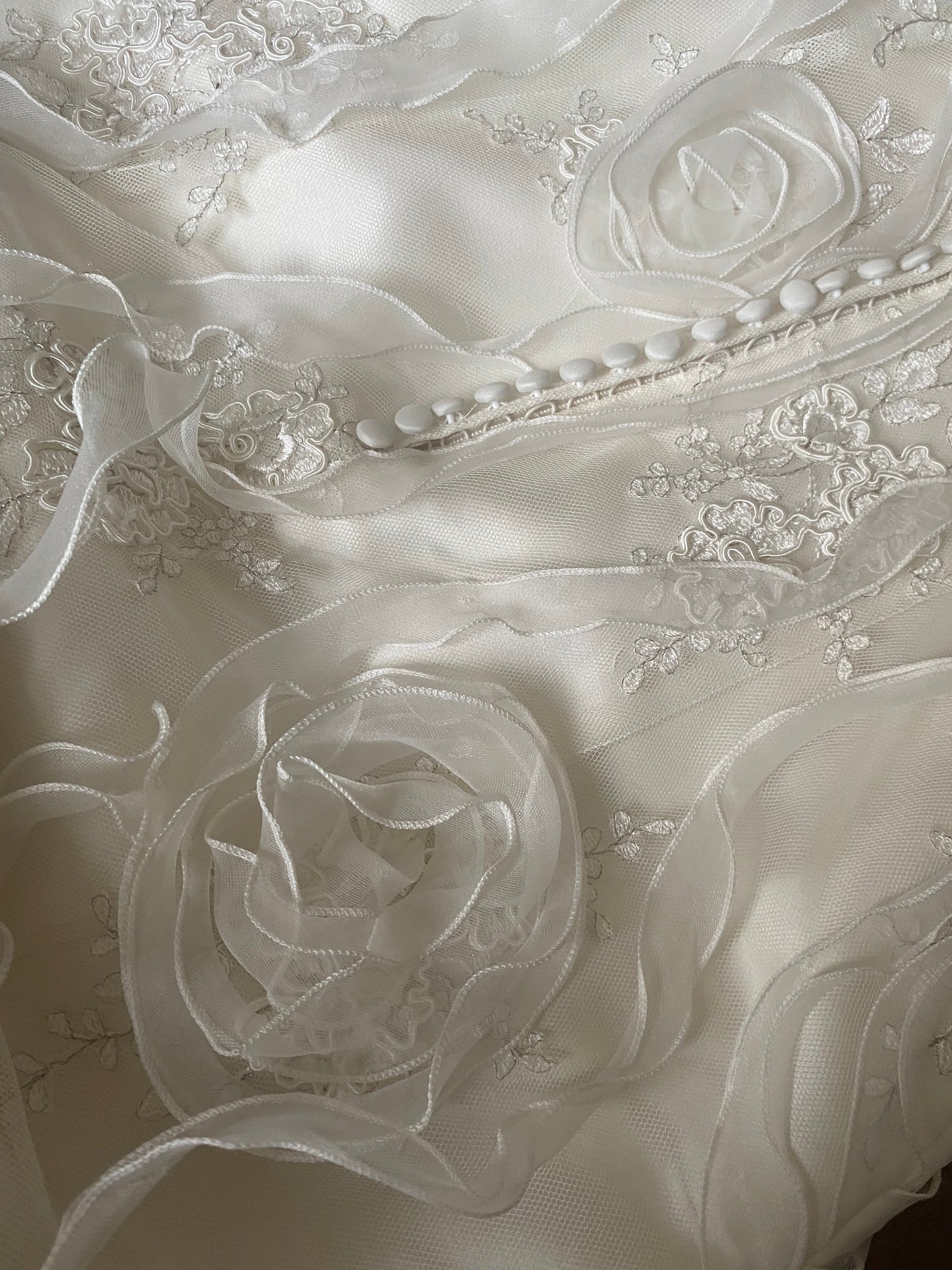 Off white one shoulder wedding dress with beautiful frilly fabric detailing, embroidery & lace - a padded boned structured inside with a elastic waist corset that keeps the dress in place - the dress has a fishtail hem & long trail with a netted underskirt to hold the shape of the dress - button detailing down the back & a zip up the back UK 12