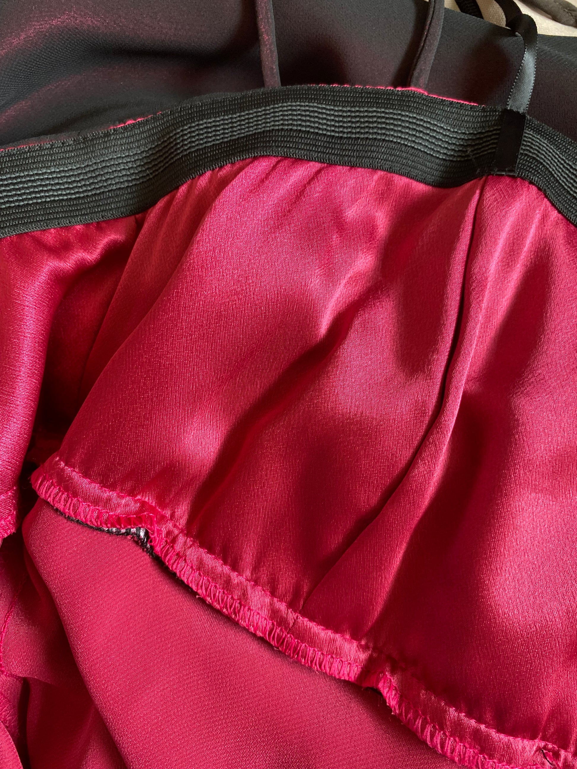Pink halter-neck evening gown with a sheer black overlay & a zip up the back UK 12