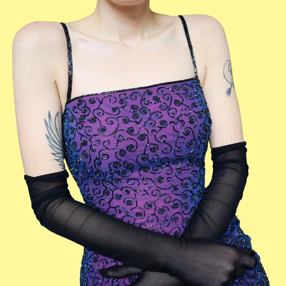 🌹Purple 100% silk heavily beaded evening dress with a bright pink lining, a padded bust, an open back with a hook & eye fastening in the middle & a zip up the back UK 10-12🌹