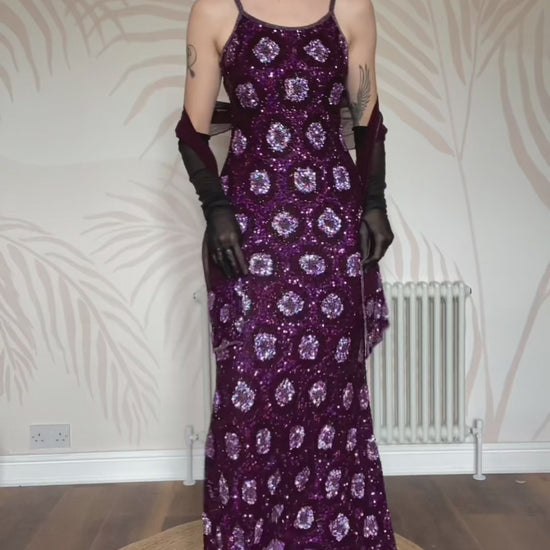 Purple Aftershock sequin 100% silk evening gown & shawl UK 10
