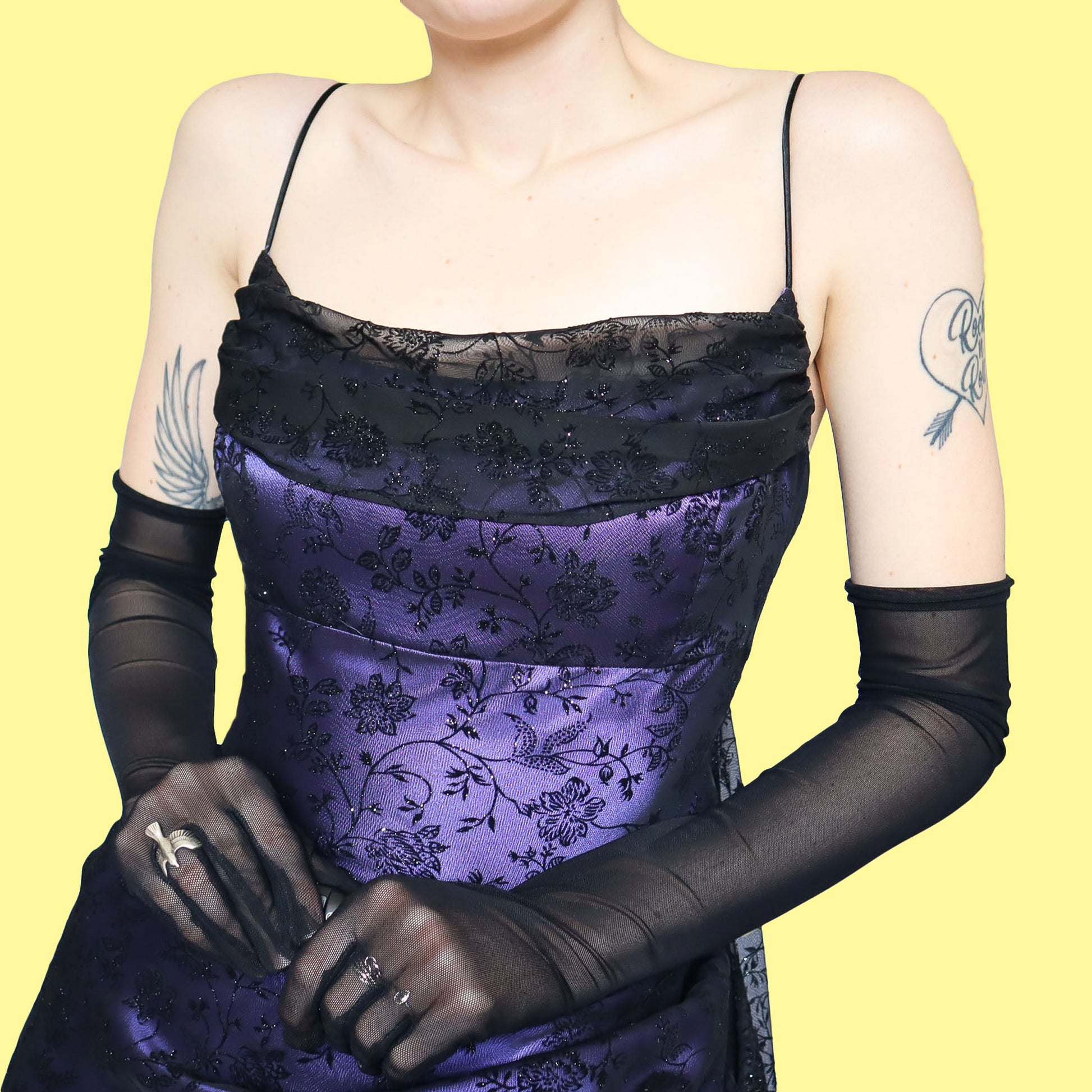 🌹Purple evening dress with glittery floral overlay, a cowl neckline, a long trail down the back & a zip up the back UK 18🌹