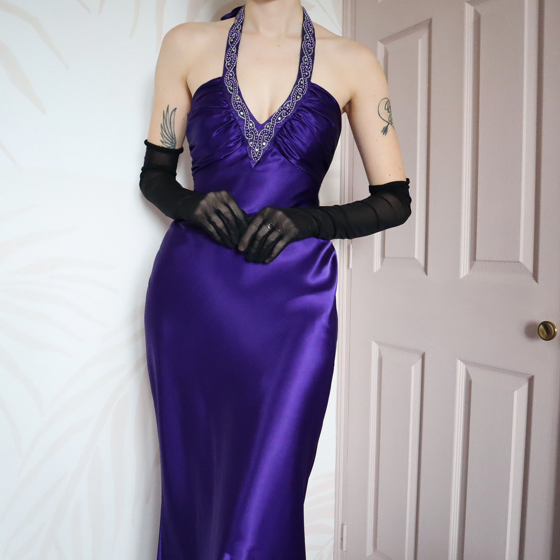 Purple satin halterneck evening dress with a tie at the back of the neck, a lightly padded bust, bead detailing & a zip up the back UK 10
