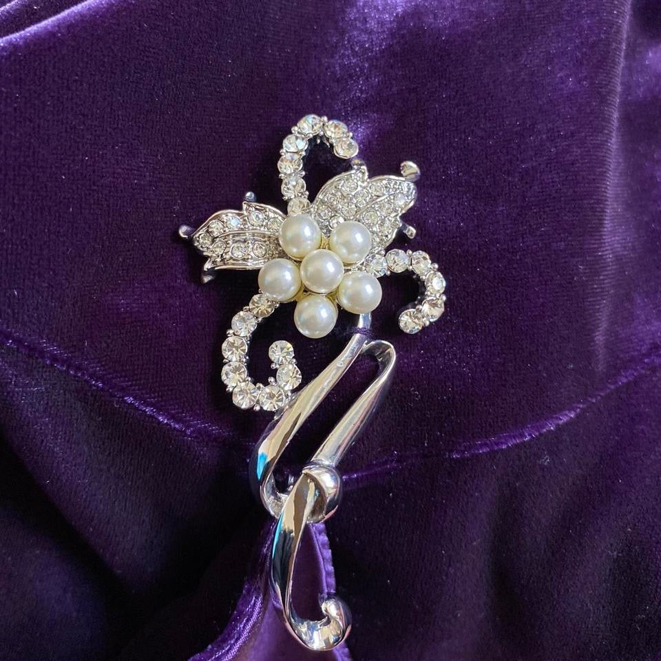 Purple velvet stretch evening gown with a draped frill to one side, a diamanté broach detail, a cowl neckline & a zip up the back UK 10