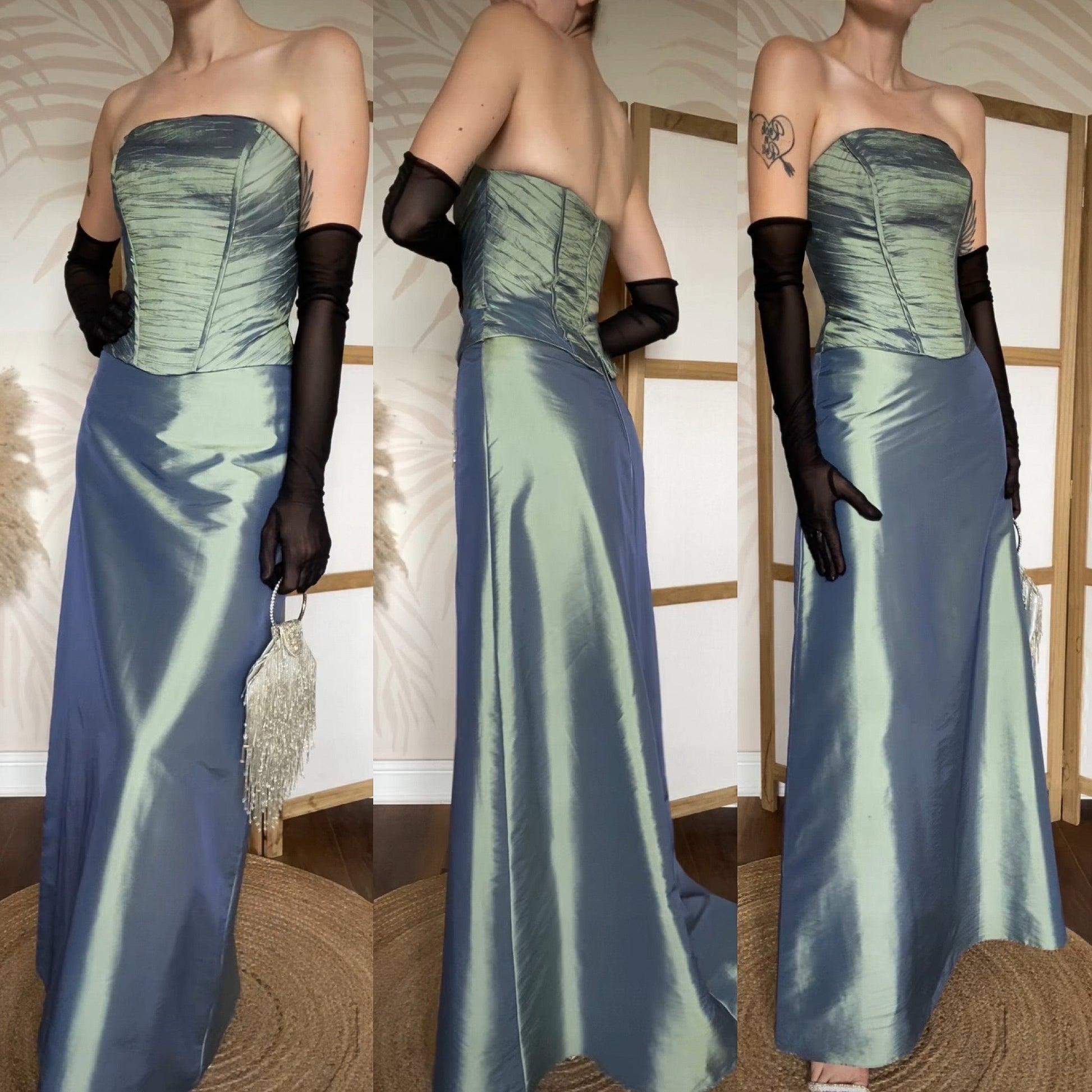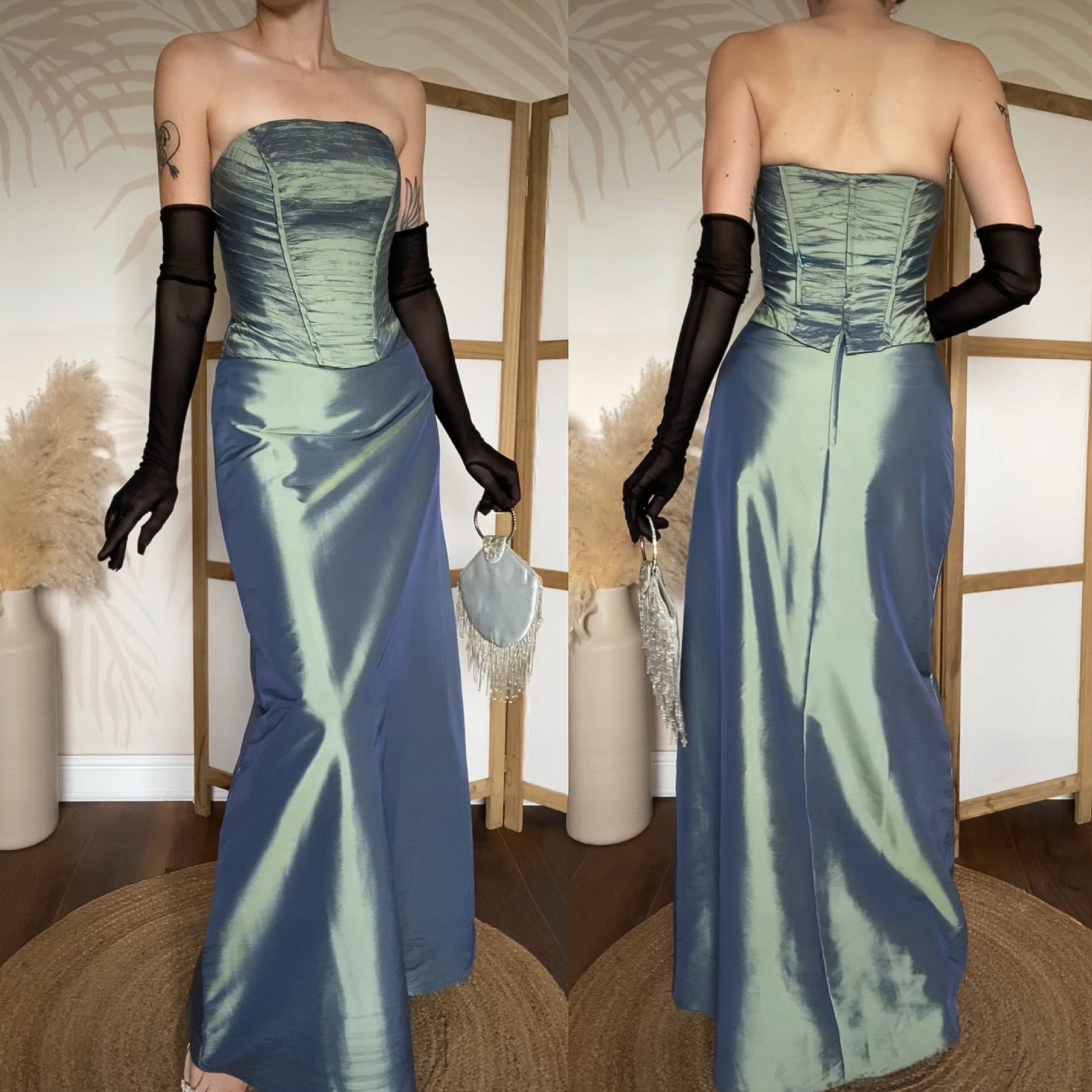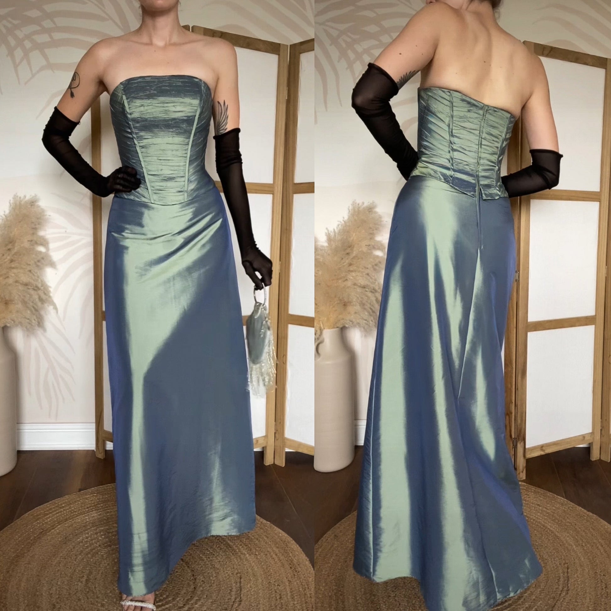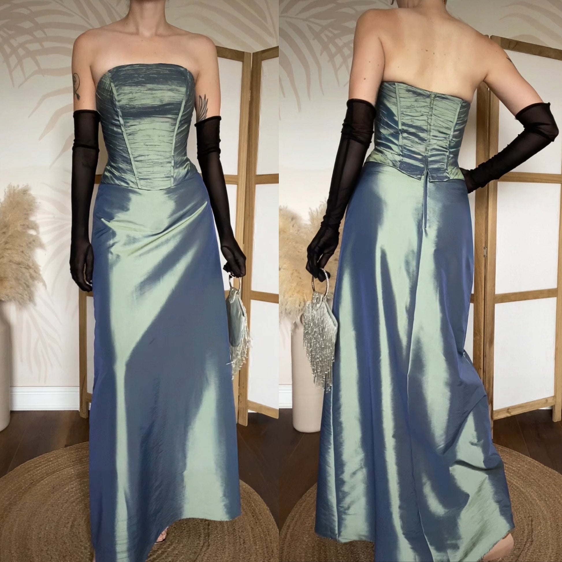 Green iridescent strapless prom dress with a boned corset style top half, a light a-line shape to the hem & a zip up the back uk 12