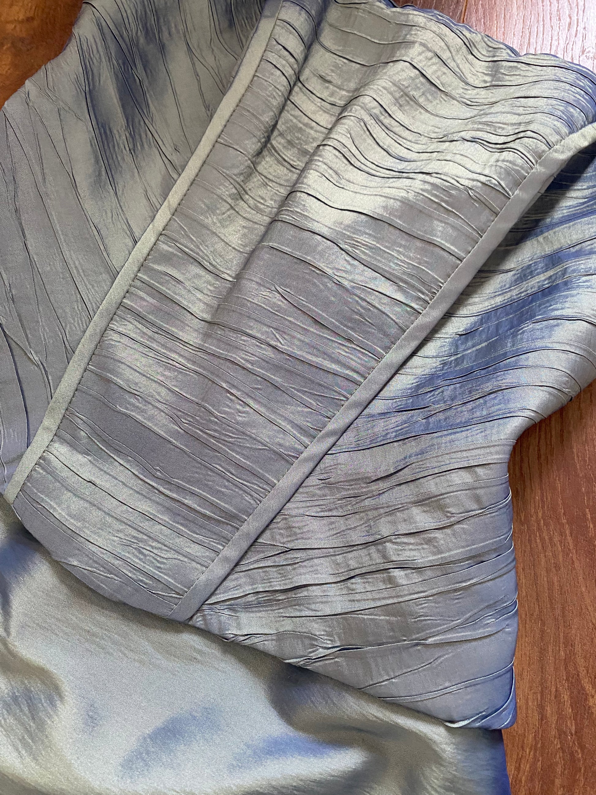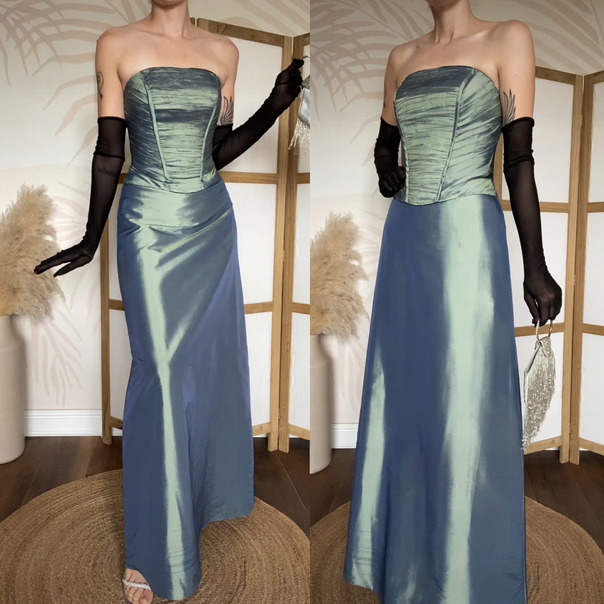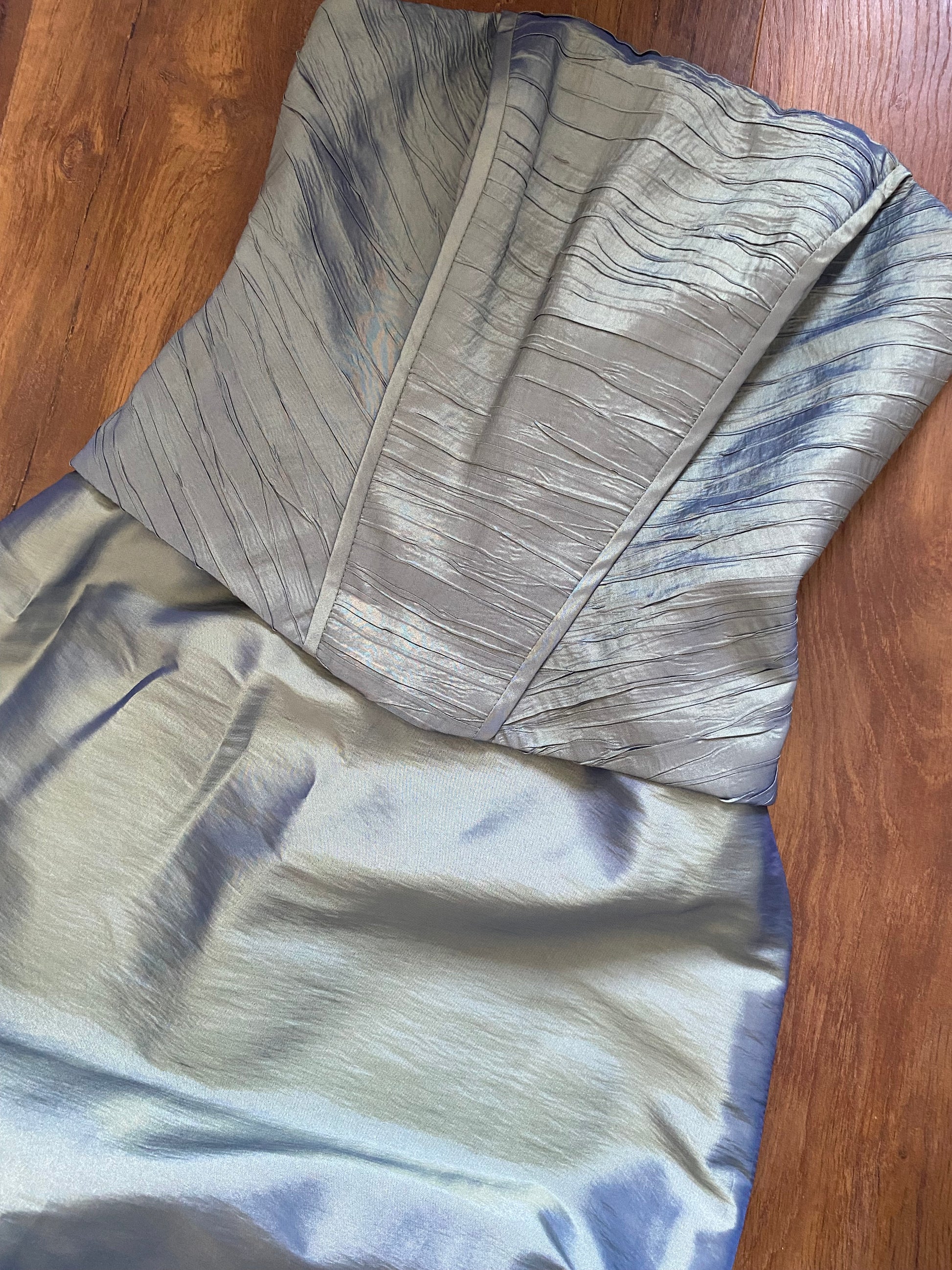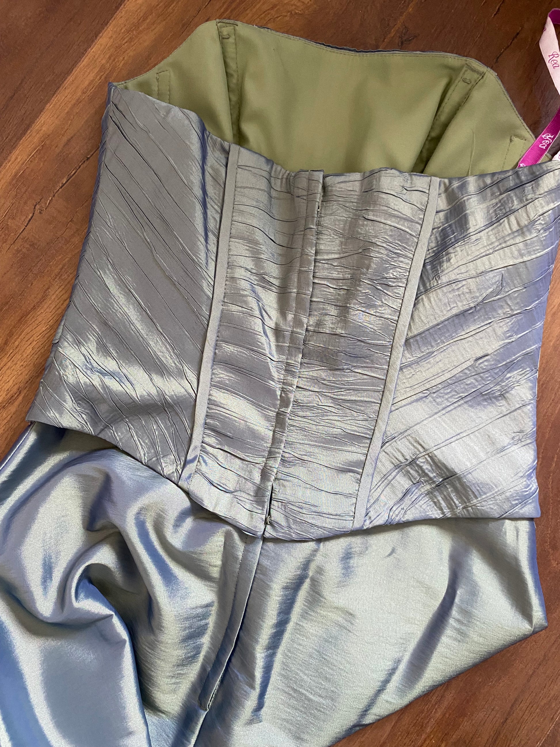 Green iridescent strapless prom dress with a boned corset style top half, a light a-line shape to the hem & a zip up the back uk 12