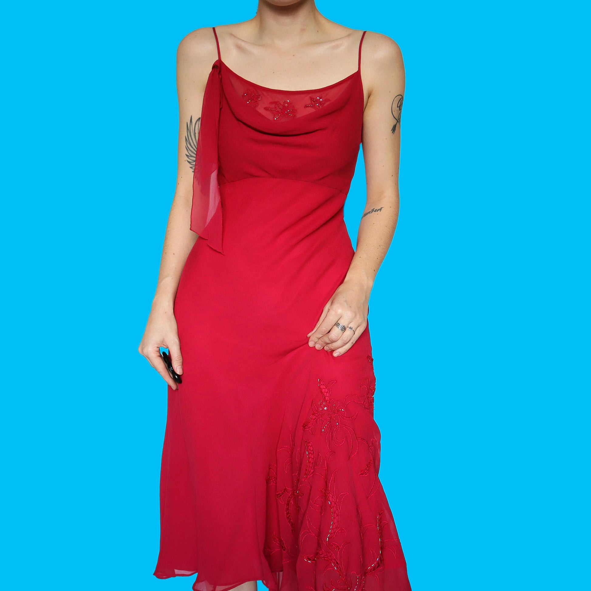 🌹Red silk slip dress UK 12🌹Stunning 100% silk red midi dress with an uneven hem, a sheer bust detail with floral beading🌹