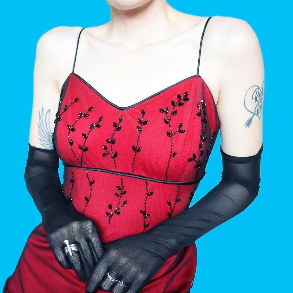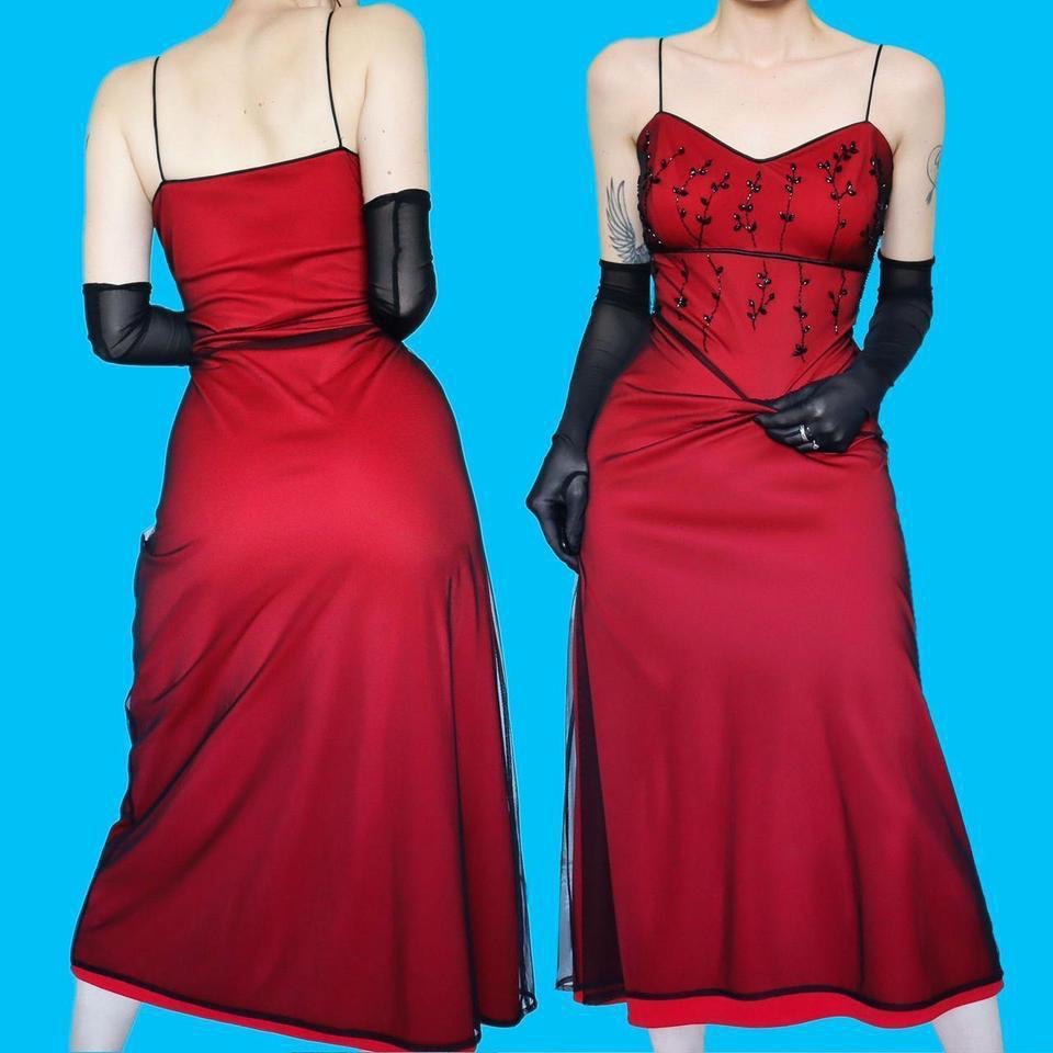 🌹Red slip midi dress UK 10🌹Beautiful red stretch evening midi dress with sheer black overlay, bead detailing to the bust & waist & a zip up the side🌹