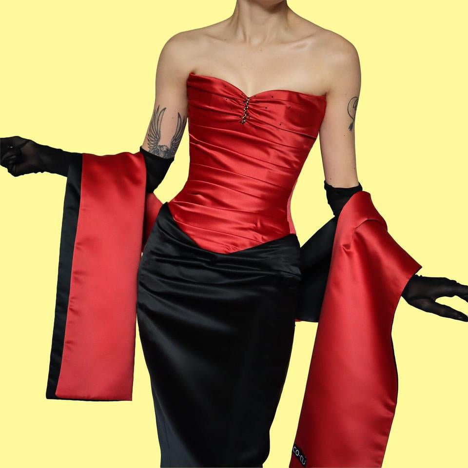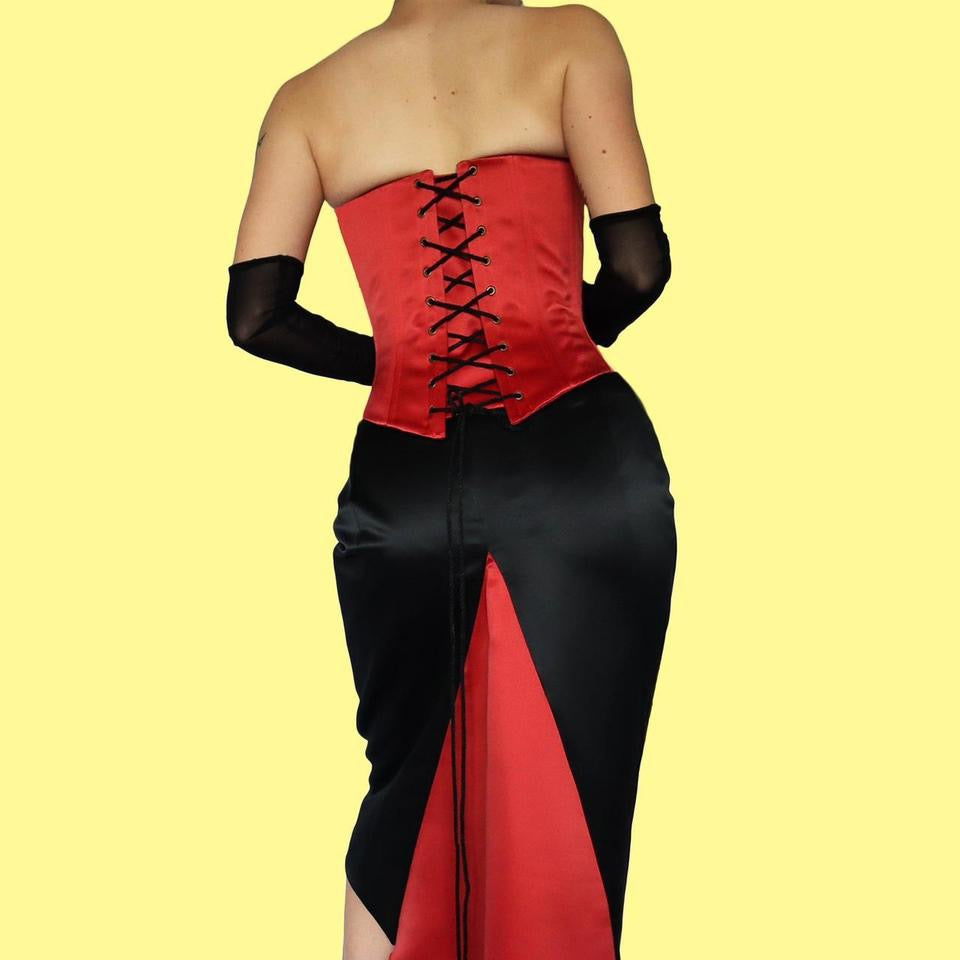 Red & black 3 piece corset, skirt & shawl set UK 12 - the corset is boned with a light gem detailing & adjustable lacing at the back - the shawl is two toned & the skirt is high waisted, midi length & has a long trail at the back