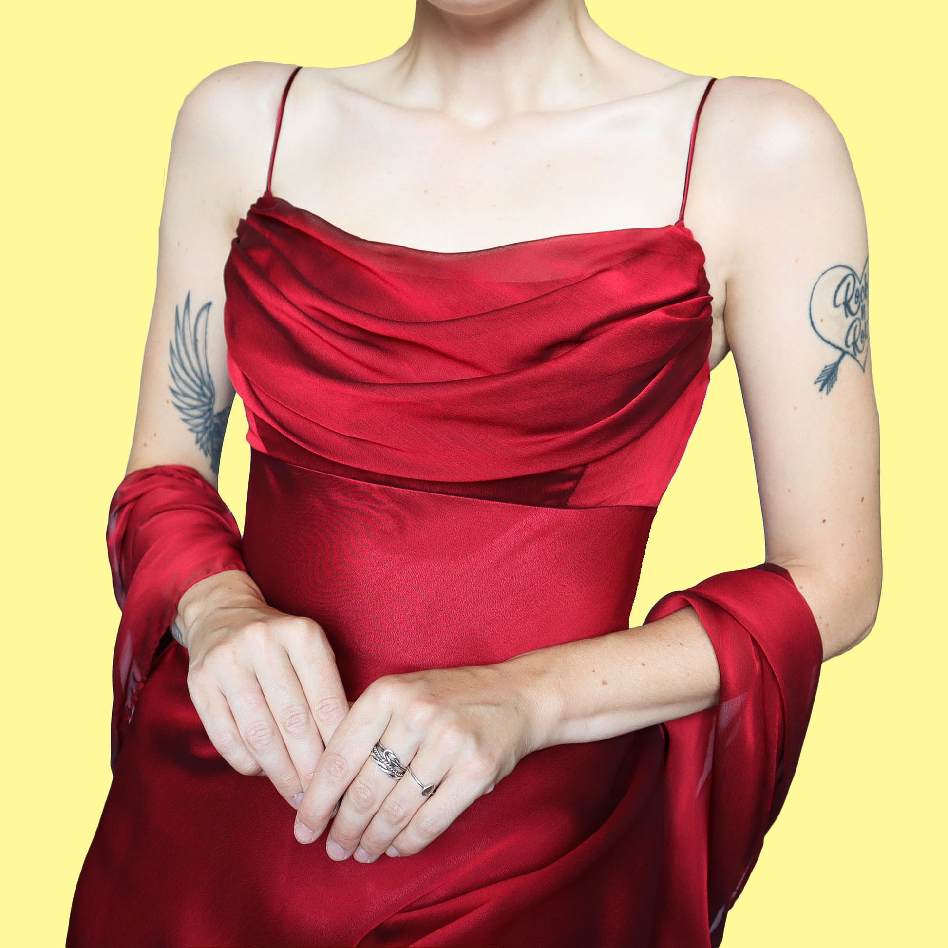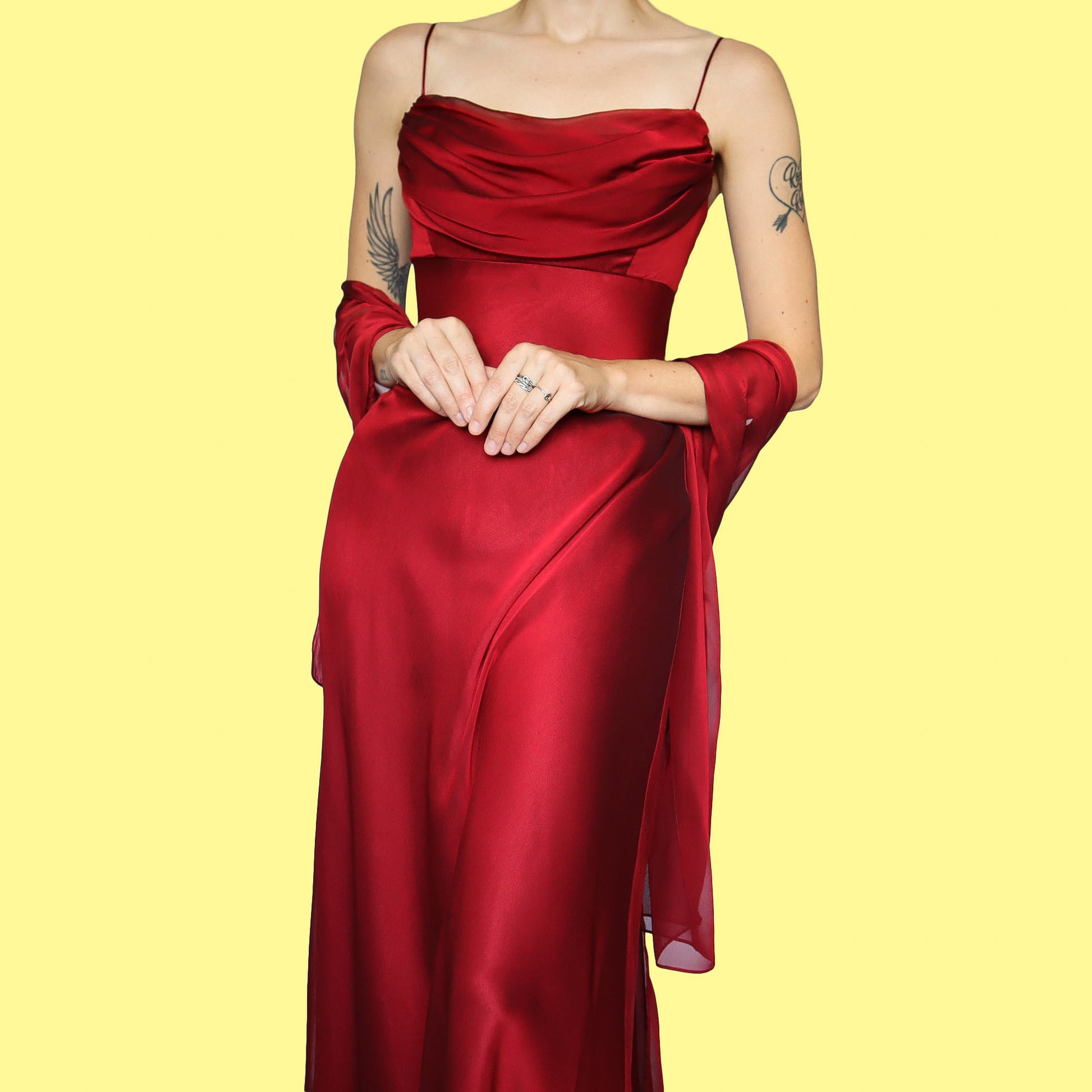 Red chiffon evening dress gown with cowl neck, a long trail down the back, a matching shawl & a zip up the back UK 12