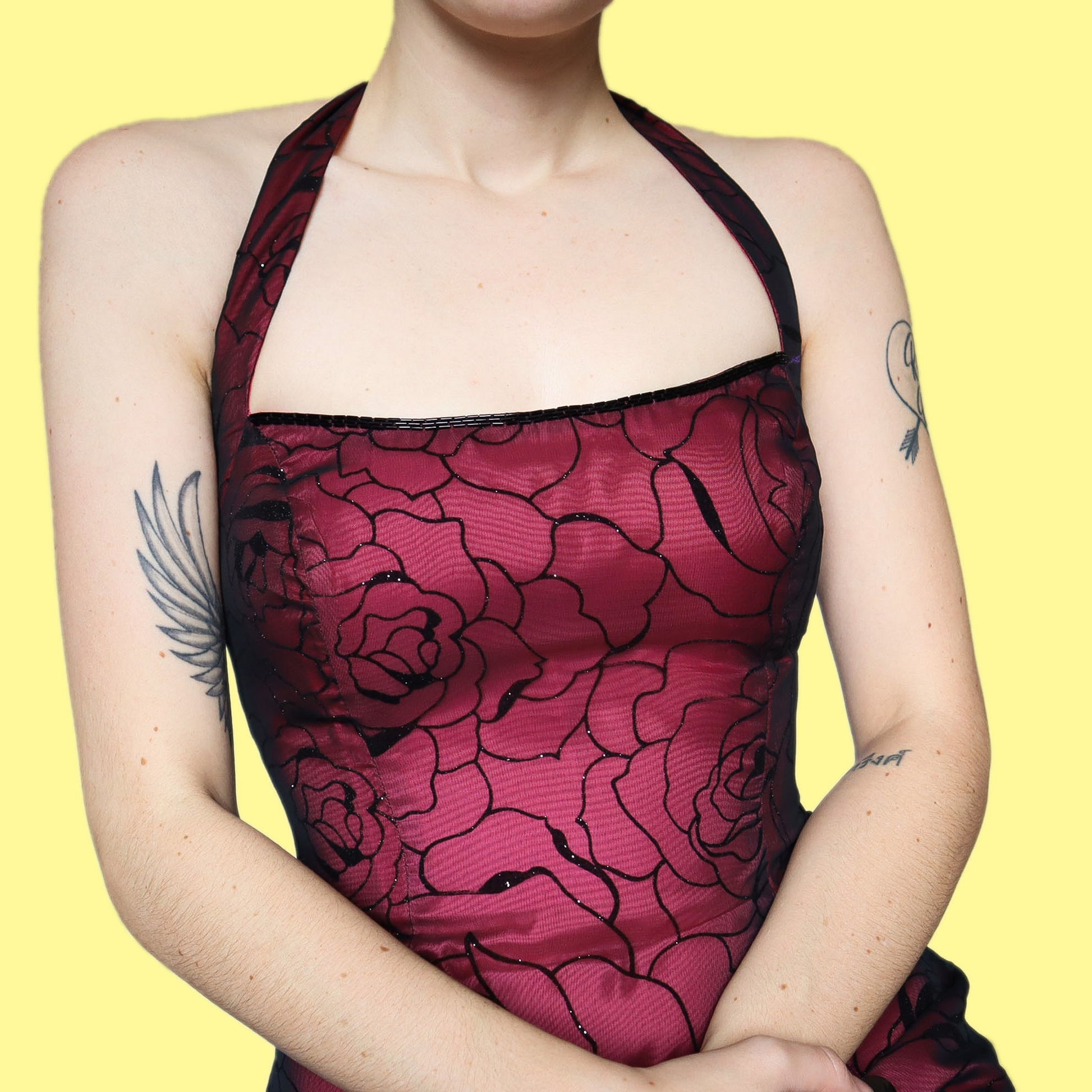 🌹Glittery red halter neck evening dress UK 10🌹Stunning red evening dress with black sheer glittery rose print overlay, bead detailing on the bust, a hook & eye fastening at the back of the neck & a zip up the back🌹