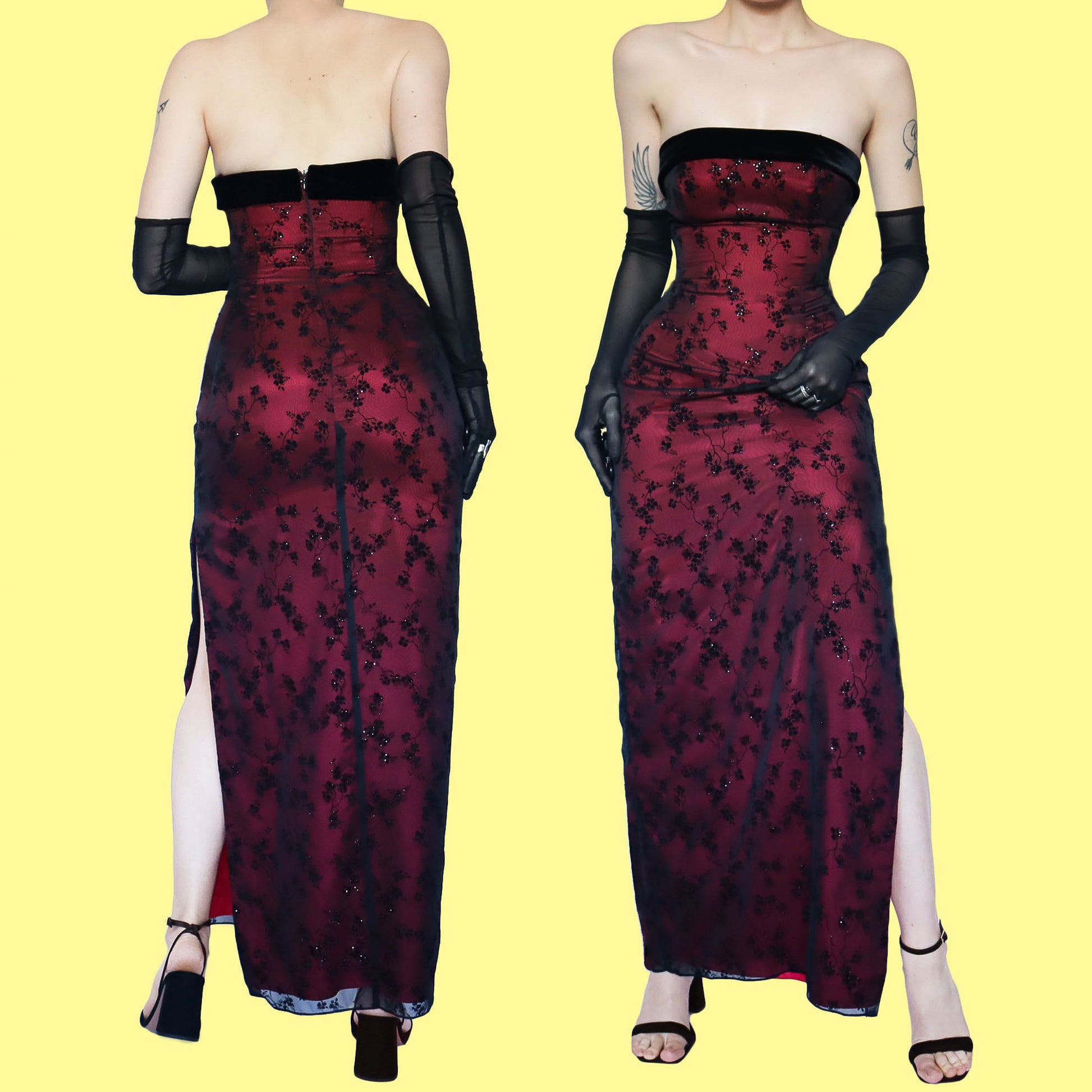 🌹Black & red floral evening dress UK 10🌹Beautiful red strapless evening dress with a sheer glittery black floral overlay, a velvet bust detail, a boned bust, a slit down one side & a zip up the back🌹