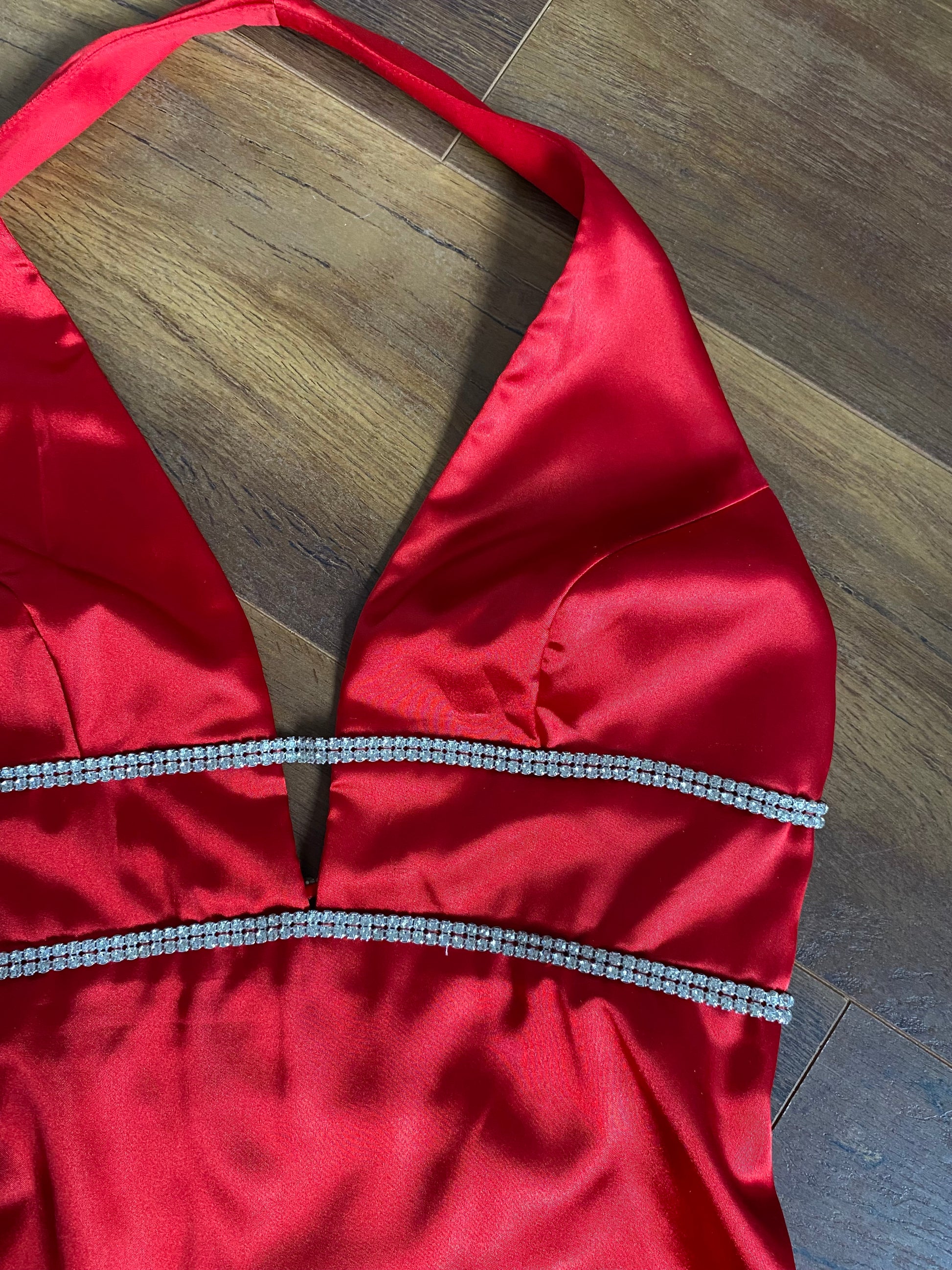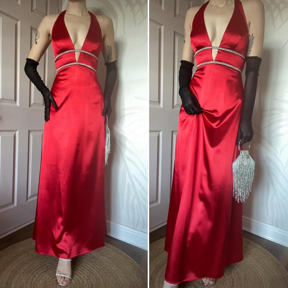 🌹Red satin halter neck evening dress with a diamanté detail waist, an open back & a zip up the side UK 10-12🌹