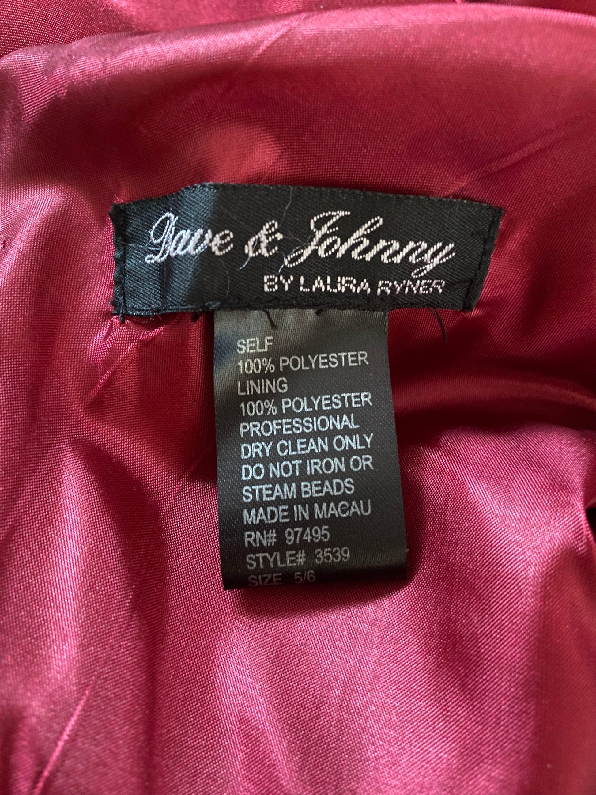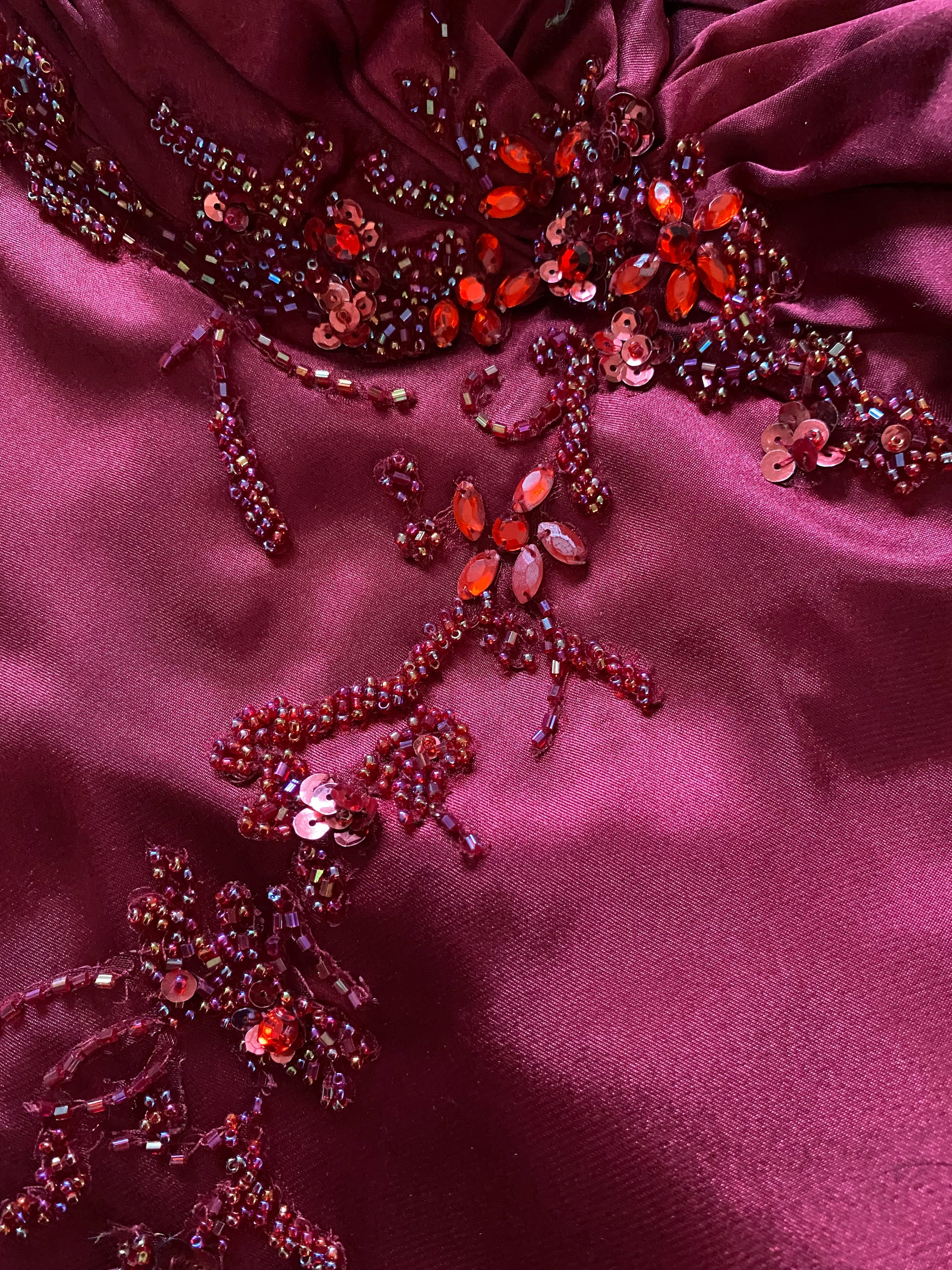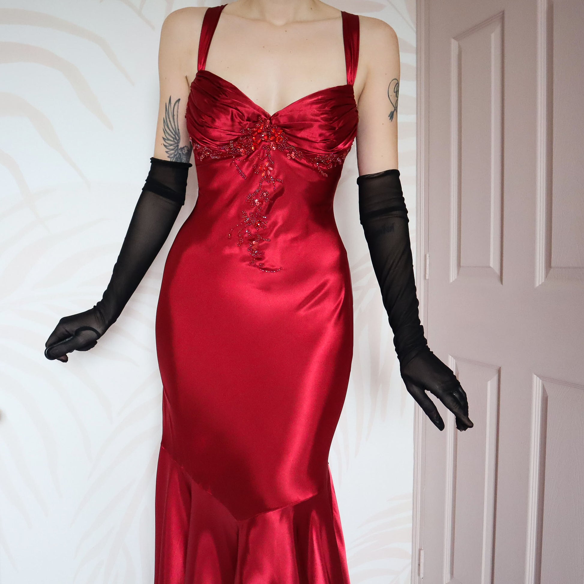 Red satin fishtail evening gown with flared hem, bead & sequin detailing, a padded bust, cross over straps & a zip up the back UK 10