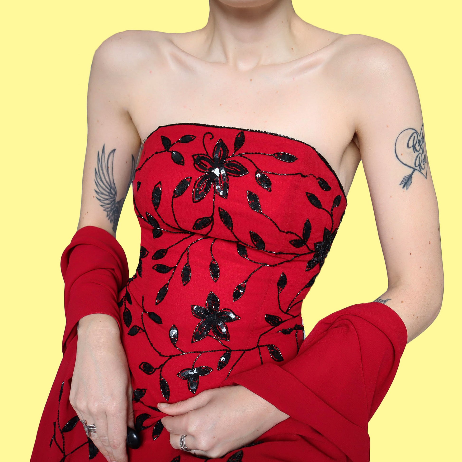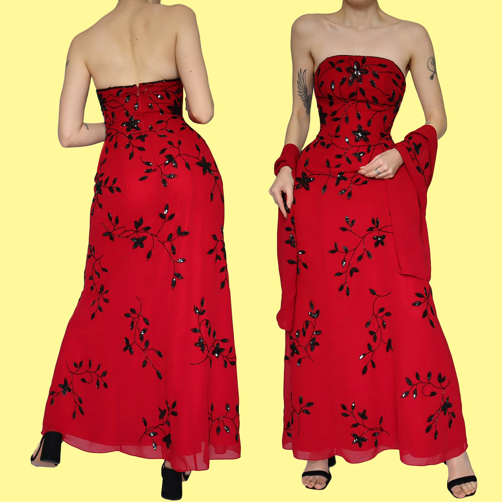 🌹Red strapless evening dress with black sequin leaf detailing, a boned bust, a zip up the back & matching shawl UK 10🌹