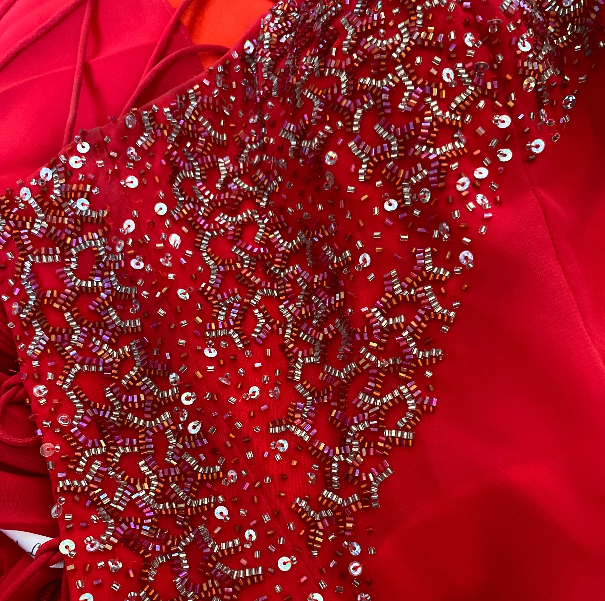 🌹Stunning red strapless evening dress with detailed beading, a boned bust, a padded bust, pleated flare at the hem, an adjustable lace up back, a matching shawl & a zip up the back UK 12🌹