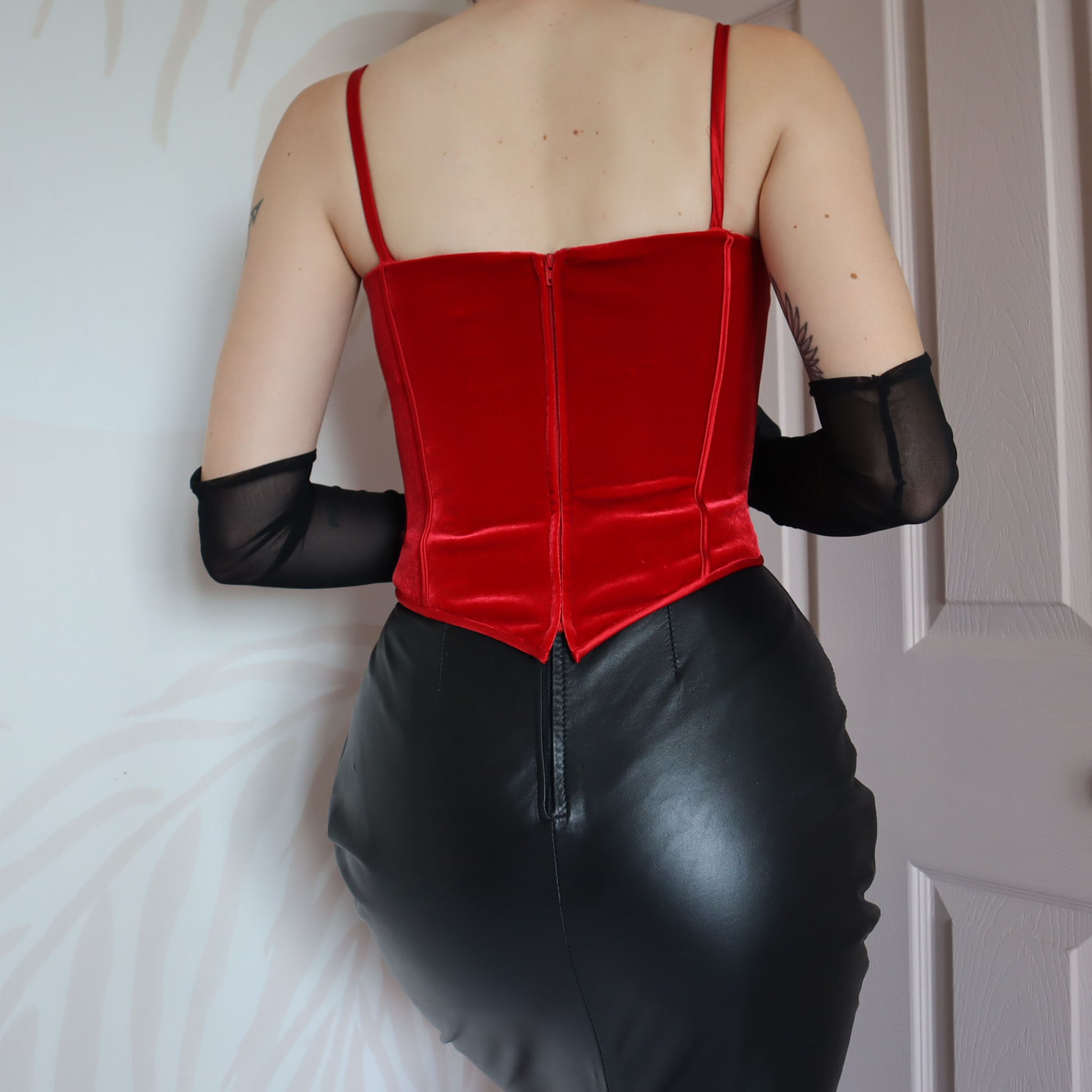 Red velvet corset top with a boned front & back, a padded push up bust, diamanté detailing on the bust & a zip up the back UK 14